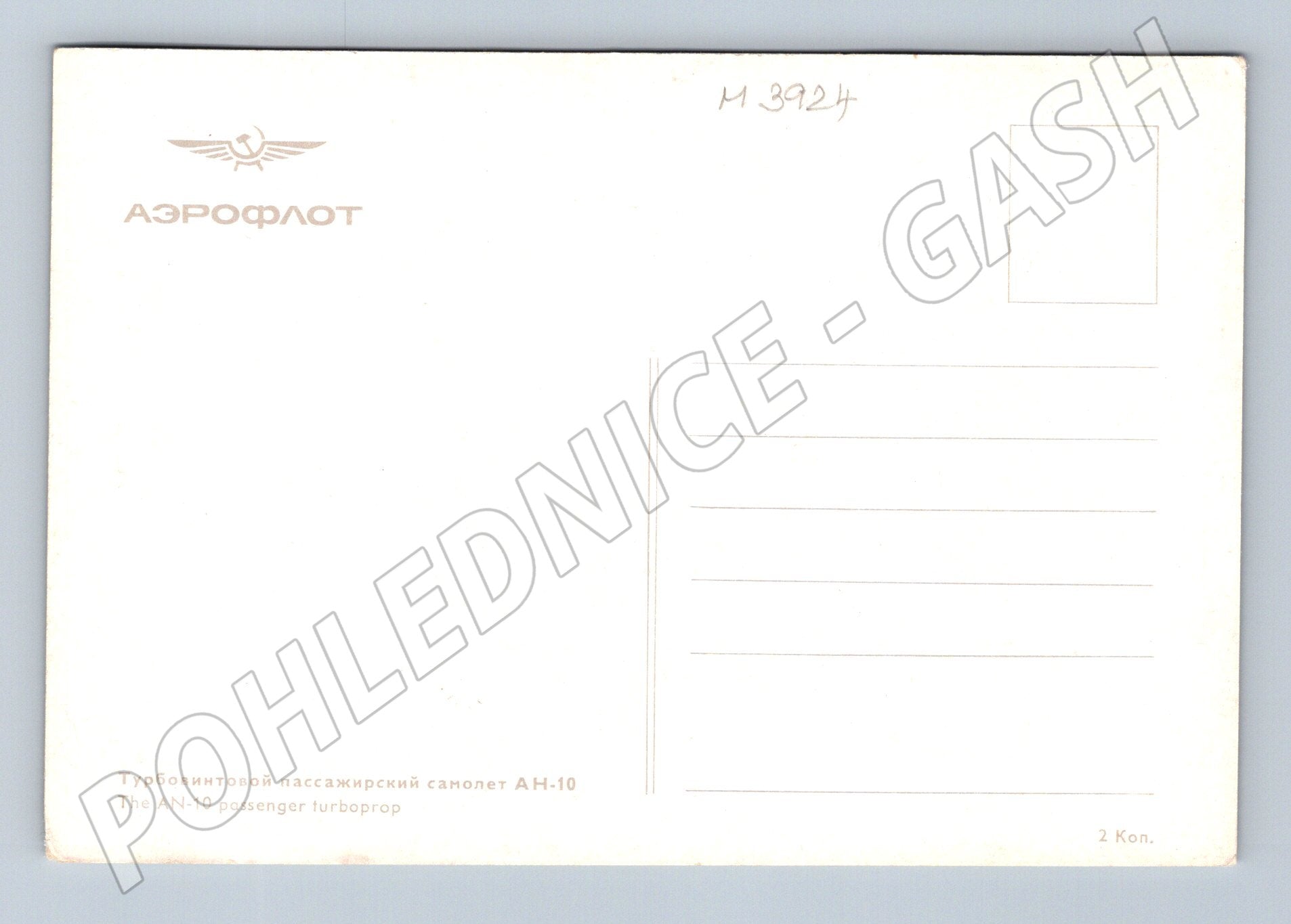 Originální sovětská pohlednice s vyobrazením turbovrtulového dopravního letounu Antonov AN-10 ve službách aerolinií Aeroflot. Na přední straně je barevná fotografie letadla v letu na modrém nebi. Zadní strana je nepopsaná, s logem Aeroflotu a dvojjazyčným popisem v ruštině a angličtině. Pohlednice představuje zajímavý sběratelský kousek pro fanoušky letectví, historických pohlednic i aerolinie Aeroflot. Zachovalý stav, odpovídající věku.