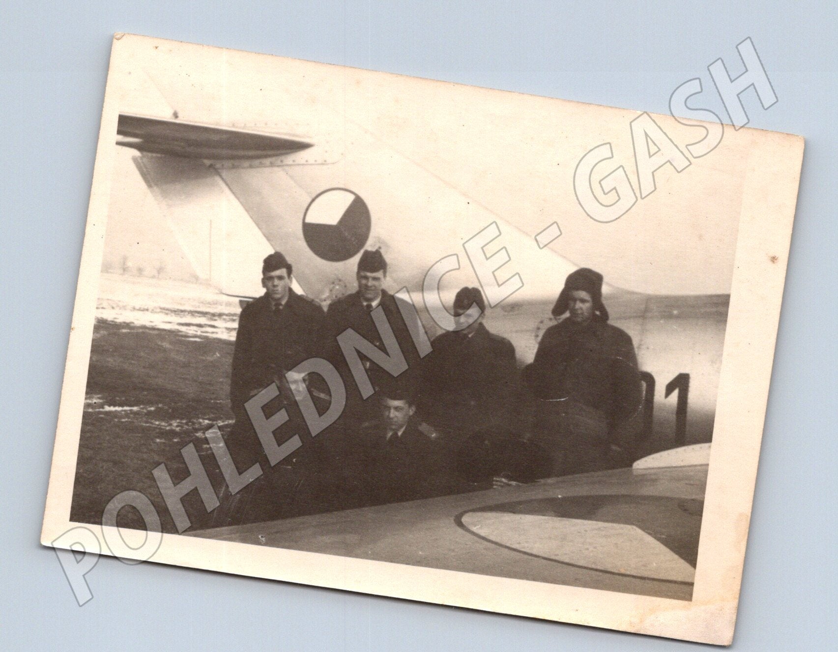 Originální černobílá historická pohlednice s motivem skupiny československých letců u trupu vojenského letadla s výsostným znakem, pravděpodobně z předválečného nebo válečného období. Na fotografii je zachyceno šest mužů v uniformách stojících a sedících u křídla letounu na letišti. Na zadní straně je pohlednice čistá, pouze s ručně psanými čísly. Velmi zajímavý sběratelský kousek pro milovníky československé vojenské historie a letectví. Stav dobrý, odpovídající stáří, viz foto.