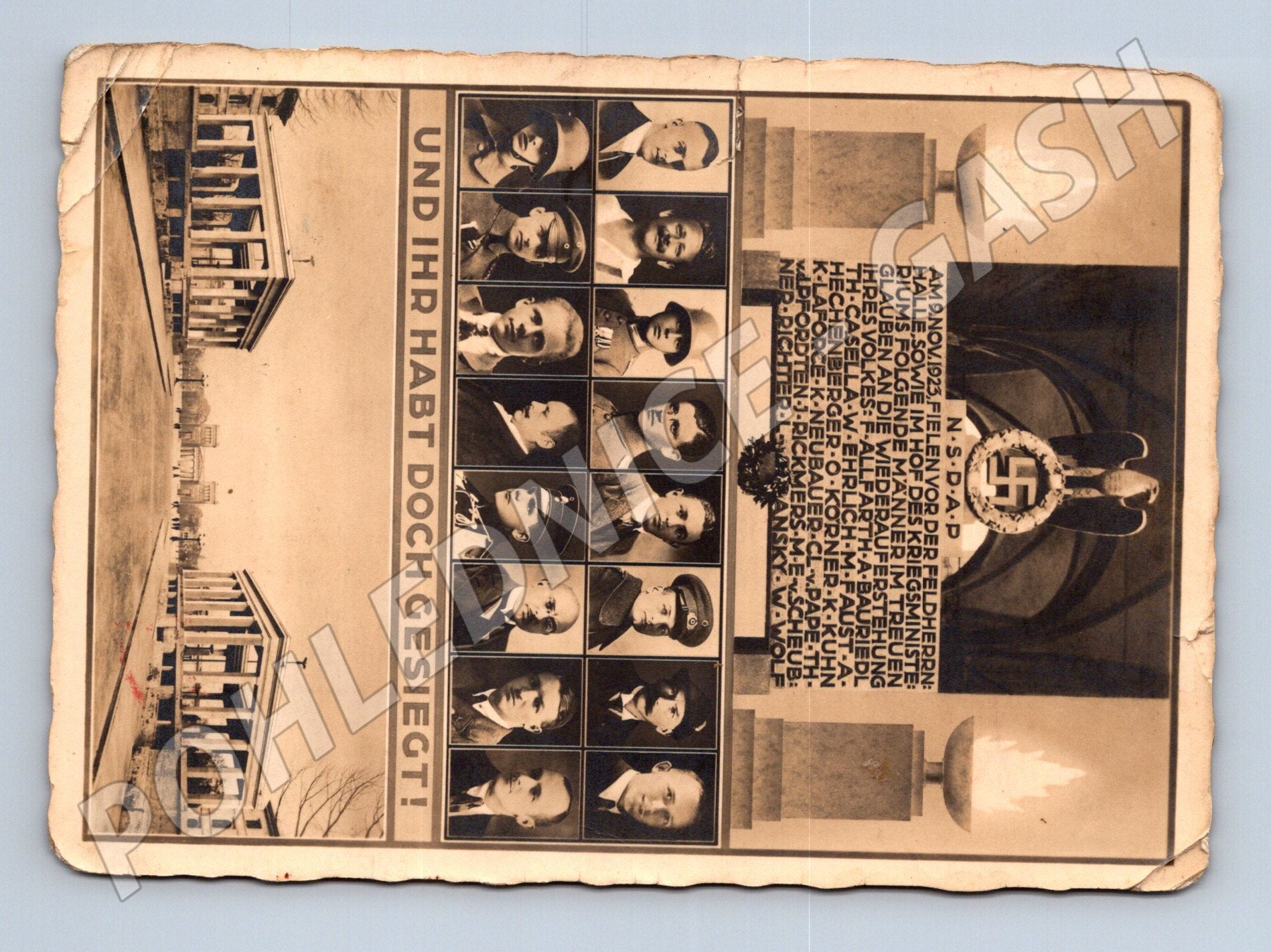 Originální historická propagandistická pohlednice z roku 1942 zachycující pamětní motiv padlých členů NSDAP s centrálním textem Unsere Gefallenen doplněným dlouhým seznamem jmen dobových stranických příslušníků dále velká orlice se symbolem režimu dekorativní rám s věčným světlem a monumentální architekturou připomínající mnichovské památníky tzv kultu mučedníků spodní část zobrazuje dvojici monumentálních staveb a slavnostní pochodový motiv typický pro propagandu třetí říše zadní strana nese protektorátní poštovní známky Čechy a Morava několik jasně čitelných poštovních razítek s datem z listopadu 1942 autentický dobový válečný tisk vhodný pro sběratele období 1939 až 1945 filatelisty a badatele zabývající se protektorátní poštovní historií a válečnou propagandou jedná se výhradně o historický artefakt a studijní materiál nejedná se o podporu ideologie stav viz foto