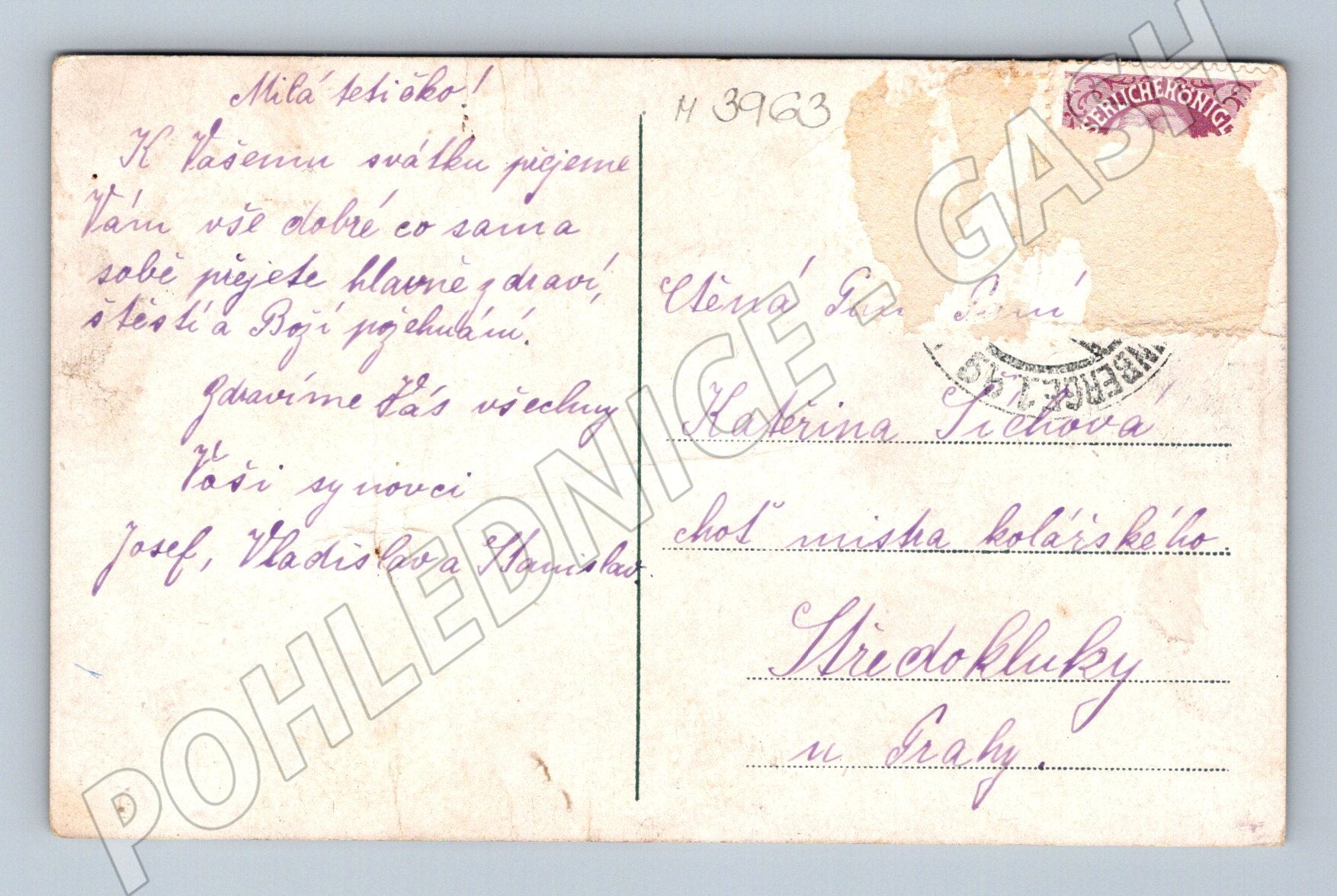 Starý barevný pohled malého formátu, zobrazující Prahu – Staroměstskou mosteckou věž a pomník Karla IV. Pohlednice pochází pravděpodobně z první poloviny 20. století. Na přední straně je krásné kolorované zobrazení významné pražské památky, s výhledem na Karlův most a okolí. Pohlednice je prošlá poštou, s dochovaným rukopisem a adresou na zadní straně, známka částečně odstraněná. Stav odpovídá stáří: rohy a okraje místy lehce opotřebené, drobné stopy po ohybu v horní části.