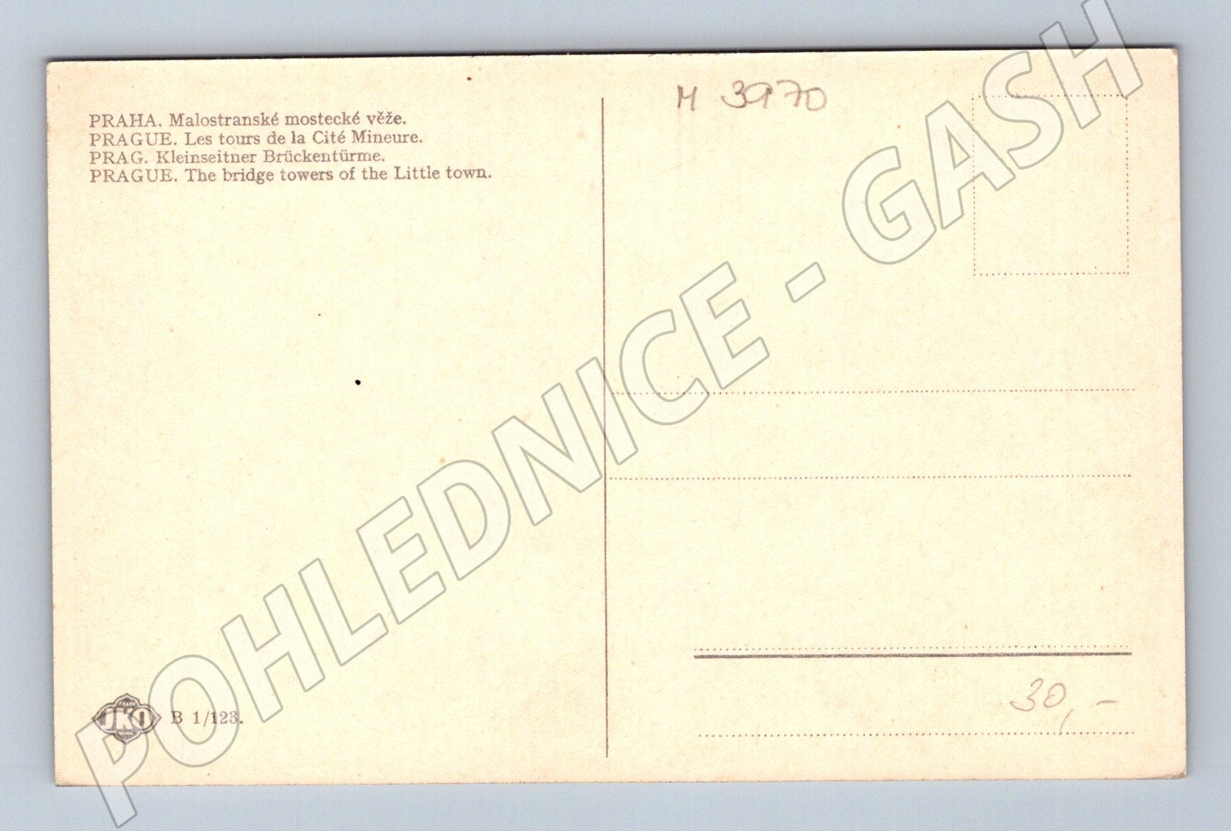 Originální stará pohlednice s pohledem na Malostranské mostecké věže v Praze. Na pozadí je krásně vidět panorama Pražského hradu a katedrály sv. Víta. Pohlednice je ve velmi dobrém sběratelském stavu bez popisu či známky, určena pro milovníky historické Prahy a architektury. Na zadní straně jsou popisy ve čtyřech jazycích (česky, francouzsky, německy, anglicky). Vydavatel označen značkou JKO, č. B 1/123. Skvělý přírůstek do sbírky pražských motivů nebo k dekoraci.
