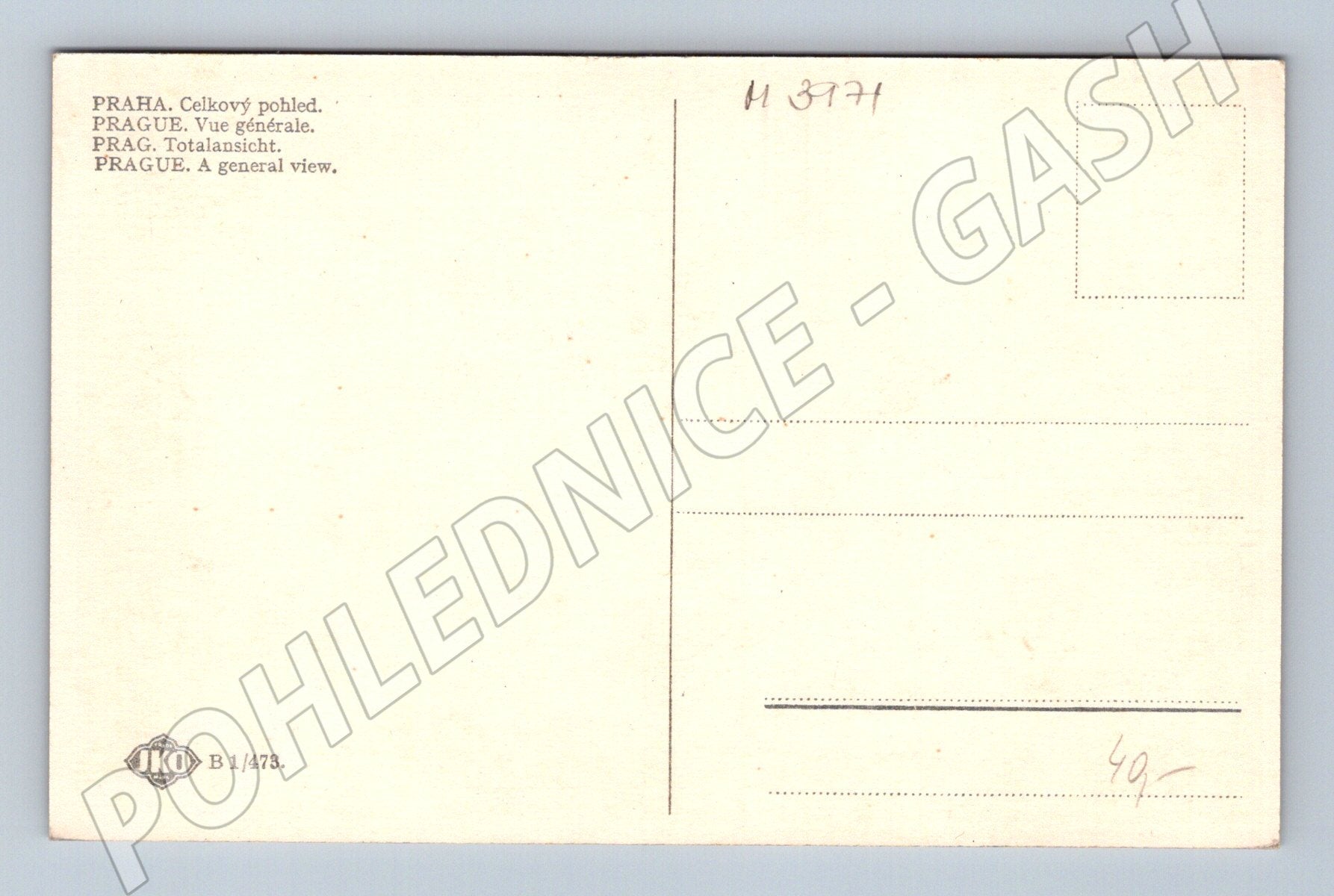 Starobylá pohlednice zachycující celkový pohled na historické centrum Prahy s monumentální Týnským chrámem v popředí a Pražským hradem v pozadí. Na lícové straně pohlednice je nápis Praha. Celkový pohled . Tato pohlednice pochází z období první poloviny 20. století, což dokládá jak formát, tak způsob tisku a dobový charakter fotografie. Zadní strana je neprošlá a vepsány jsou názvy ve čtyřech jazycích (čeština, angličtina, francouzština, němčina). Pohlednice je ve velmi dobrém stavu vhodná pro sběratele, milovníky staré Prahy nebo jako stylová dekorace.