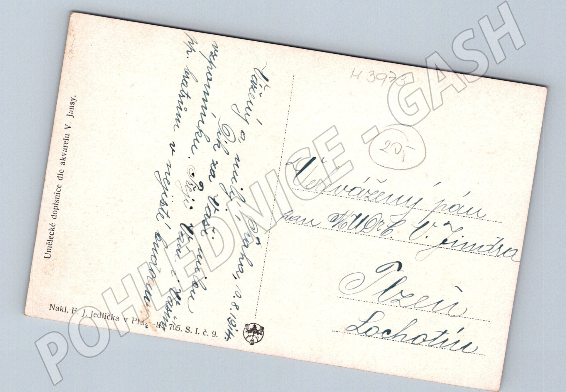 Originální stará pohlednice s motivem Chrámu sv. Mikuláše v Praze. Jedná se o malý formát pohlednice vydané do roku 1950, nakladatel F. J. Jedlička v Praze. Pohlednice je umělecky ztvárněná dle akvarelu V. Jansy a na přední straně je detailní barevná ilustrace významné pražské památky. Zadní strana je popsána a opatřena adresou, rukopisné věnování datováno 16.8.1907. Pohlednice je v pěkném sběratelském stavu, mírné opotřebení odpovídající stáří. Vhodné pro sběratele historických pohlednic i pro milovníky Prahy a architektury.