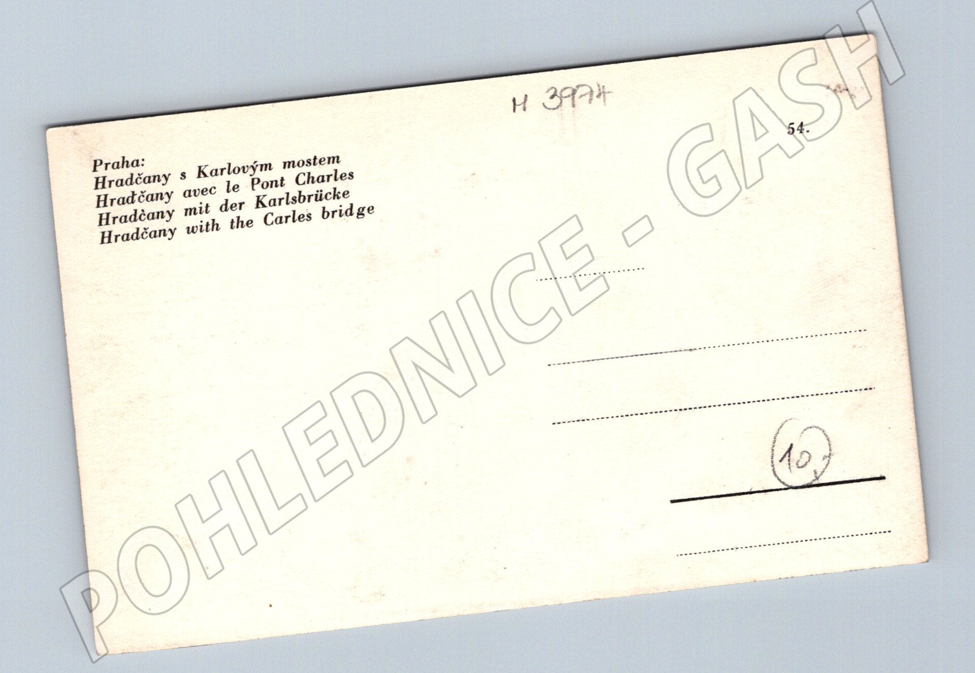 Originální stará pohlednice zachycující panoráma pražských Hradčan s ikonickým Karlovým mostem. Na čelní straně je černobílá fotografie, která nádherně vystihuje historickou atmosféru Prahy. Zadní strana obsahuje popis v několika jazycích – česky, francouzsky, německy a anglicky: Hradčany s Karlovým mostem / Hradčany avec le Pont Charles / Hradčany mit der Karlsbrücke / Hradčany with the Carles bridge . Pohlednice je ve velmi dobrém stavu, bez známek poštovního použití, ideální pro sběratele historických pohlednic či milovníky Prahy. Malý formát, odhadované stáří do roku 1950.