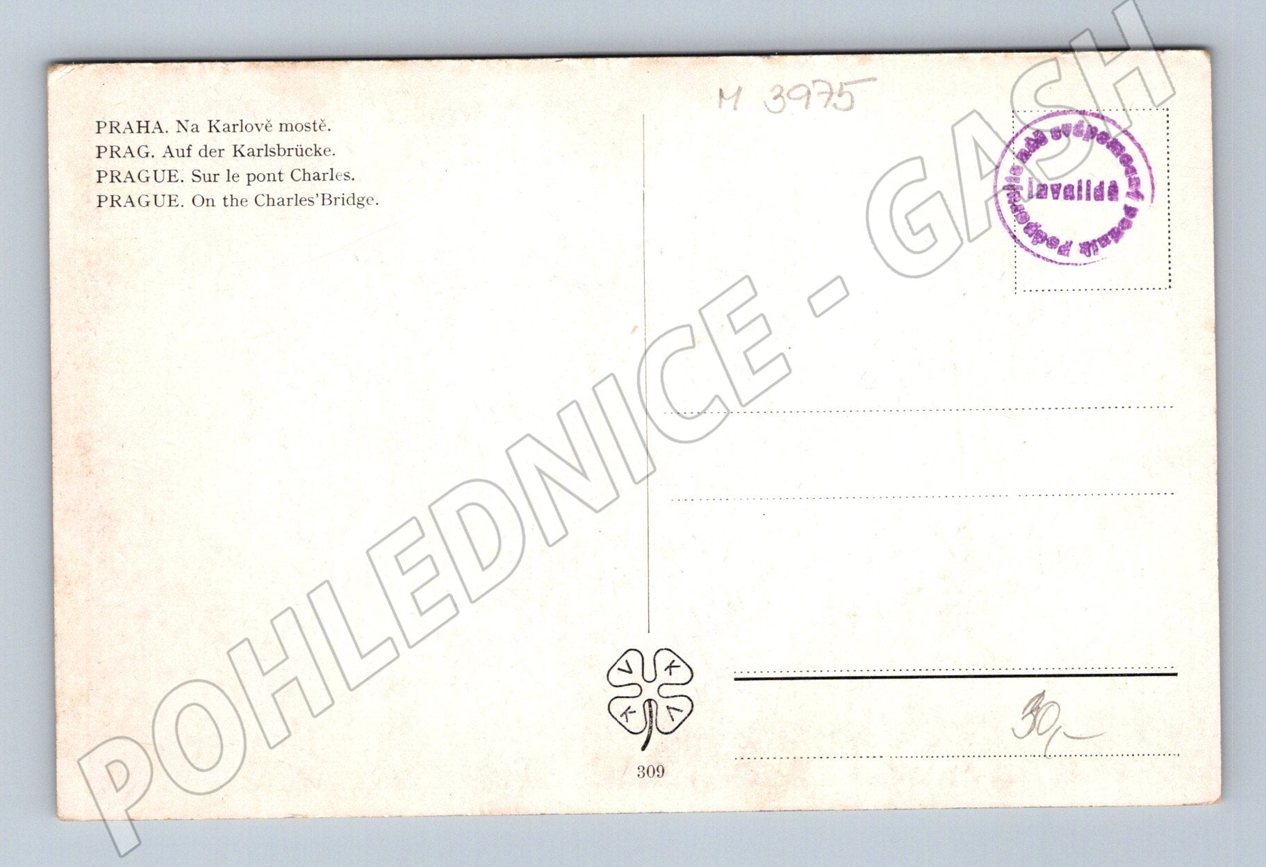 Originální černobílá pohlednice s motivem Karlova mostu v Praze. Pohlednice zachycuje krásný výhled na most a staré centrum Prahy s typickými věžemi, kopulemi a dalšími ikonickými budovami. Na zadní straně je čtyřjazyčný popis ( Na Karlově mostě / Auf der Karlsbrücke / Sur le pont Charles / On the Charles Bridge ) a je zde také razítko Svaz invalidů. Pohlednice je ve velmi pěkném stavu, bez popisu, neprošlá poštou. Vhodná do sbírky i jako dárek pro milovníky historie Prahy.