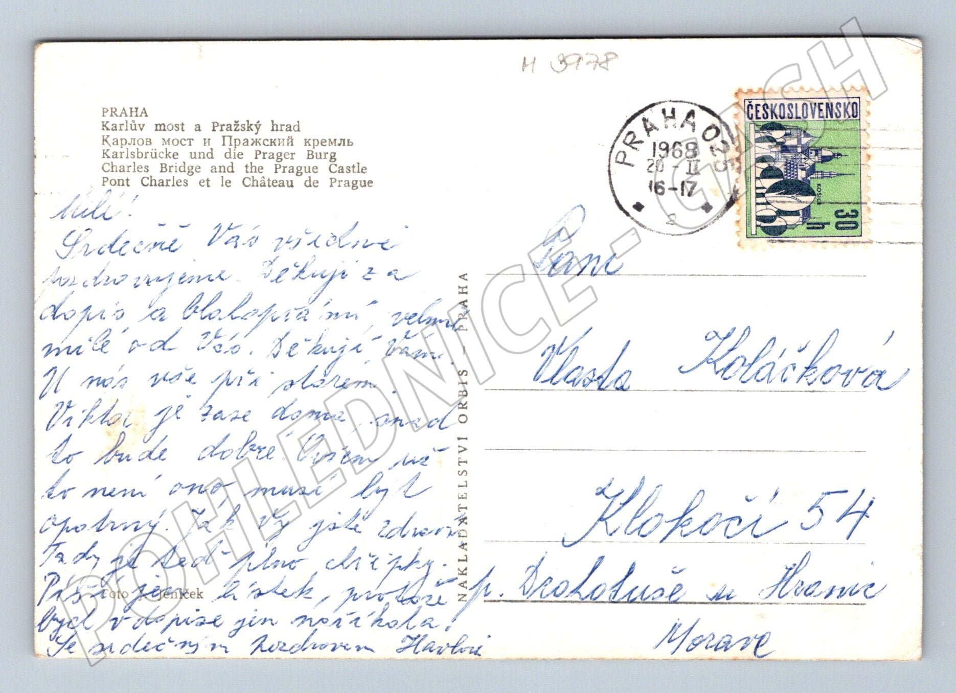 Originální pohlednice zobrazující Karlův most a Pražský hrad v Praze. Pohlednice má černobílý motiv s výraznou architekturou historického centra Prahy. Na zadní straně je ručně psaný text, poštovní známka Československo v hodnotě 30 h a poštovní razítko z Prahy datované rokem 1968. Formát pohlednice je menší, odpovídající historickým vydáním před rokem 1950. Náklad vydavatelství Orbis – Praha. Zajímavé sběratelské provedení vhodné do sbírky či jako dárek milovníkům staré Prahy a pohlednic.