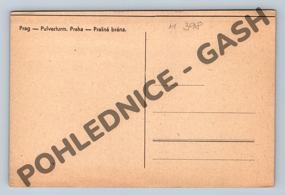 Originální stará pohlednice s motivem Prašné brány v Praze (Prag — Pulverturm, Praha — Prašná brána). Pohlednice je v klasickém černobílém provedení a zachycuje tento významný pražský historický objekt ve své původní podobě. Na zadní straně jsou uvedeny popisky v češtině a němčině, nechybí vyznačený prostor pro adresu a známku. Výborný sběratelský stav bez nápisu nebo poškození. Ideální přírůstek do sbírky pohlednic s tématikou českých památek a architektury.