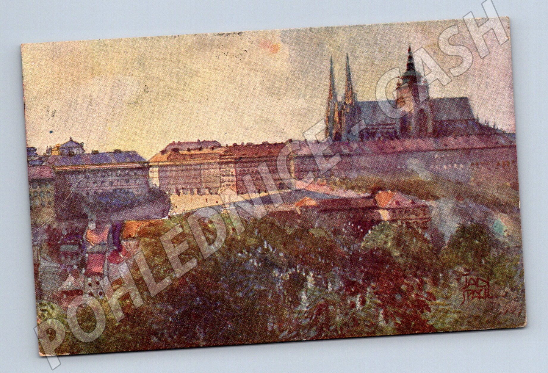 Originální stará pohlednice s malovaným motivem Pražského hradu, sídla prezidenta Republiky, jak je uvedeno na zadní straně. Na přední straně najdete krásnou, detailní malbu Pražského hradu a jeho okolí od Jana Spáčila. Pohlednice byla odeslána (známka 50 haléřů – Pošta československá), prošla poštou, text i adresát na zadní straně, datace cca 20.–30. léta 20. století. Výborný sběratelský stav, pouze drobné otlaky na rozích odpovídající stáří. Významný památkový a historický motiv z Prahy.