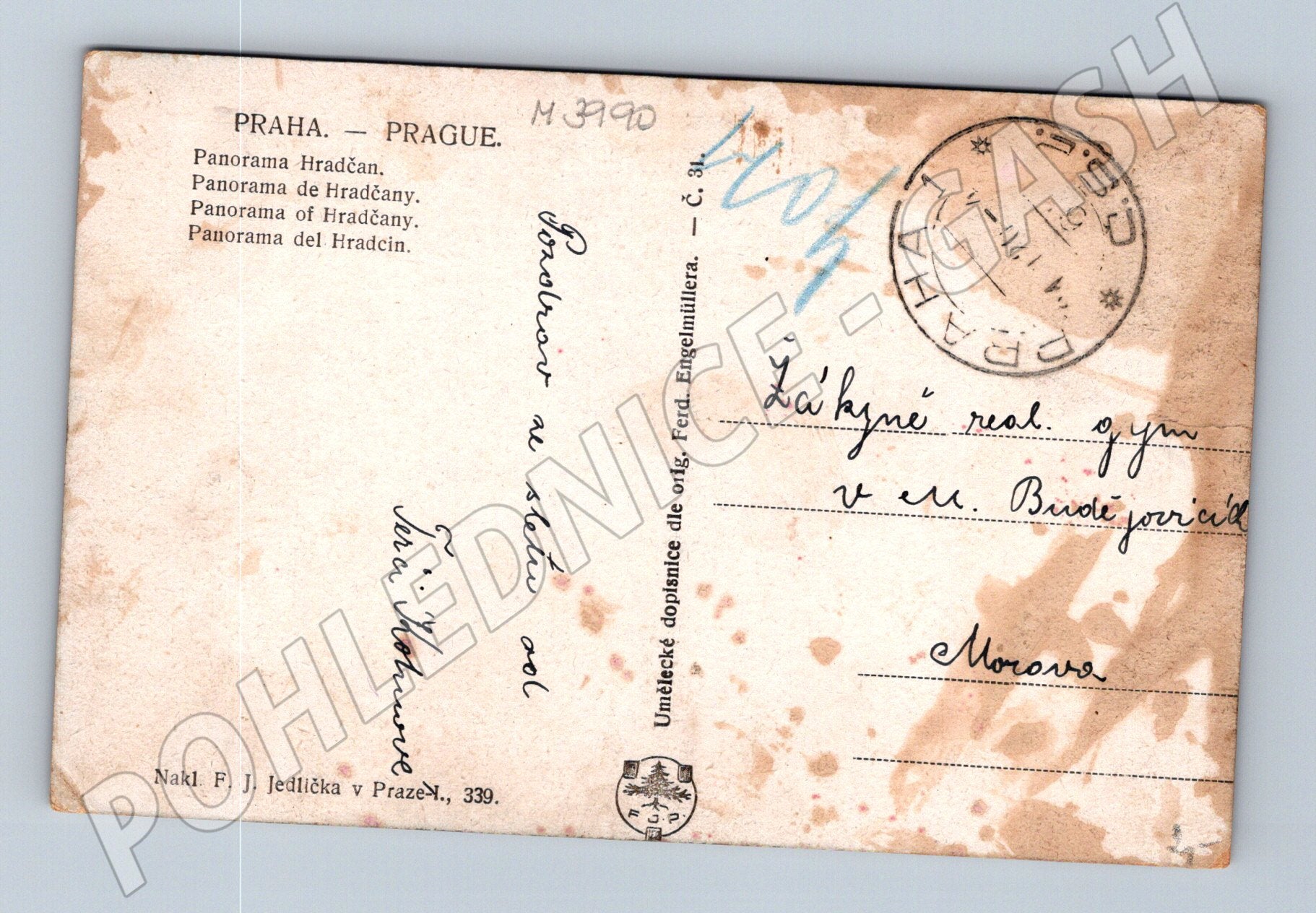 Originální historická pohlednice zobrazující panorama Hradčan a Karlův most v Praze. Pohlednice je tištěna v menším formátu, datována razítkem z roku 1914. Na přední straně zachycuje malířskou technikou krásnou scenérii jednoho z nejznámějších pražských motivů. Zadní strana obsahuje dobovou korespondenci a razítko. Vydal nakladatel F. J. Jedlička v Praze. Unikátní kousek pro sběratele historických pohlednic s tématikou Prahy a českých měst. Mírně opotřebovaná, odpovídá stáří.