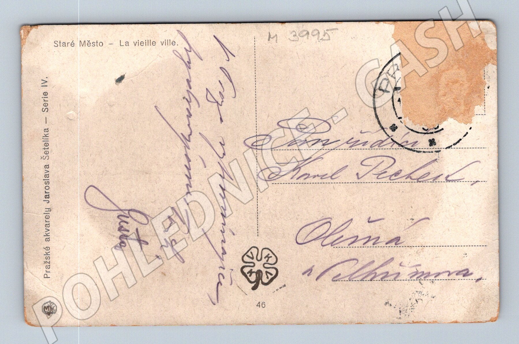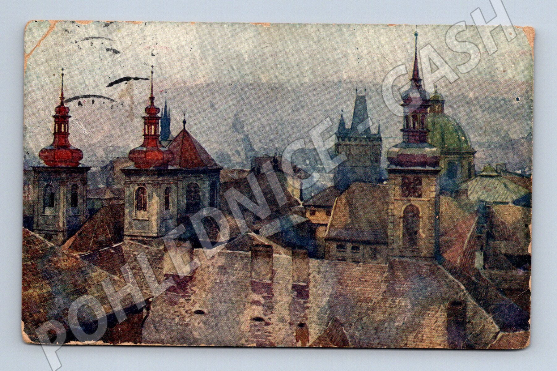 Starobylá pohlednice zachycující panorama Starého Města pražského, namalovaná akvarelem Jaroslava Šetelíka. Na pohlednici jsou zřetelné typické pražské věže a střechy, včetně Karlova mostu a dalších dominant. Pohlednice nese známky stáří – mírné opotřebení hran, lehké skvrny a oděrky. Na zadní straně je ručně psaný text a staré poštovní razítko, nečitelný zbytek známky. Vhodné pro sběratele historických pohlednic i milovníky Prahy.