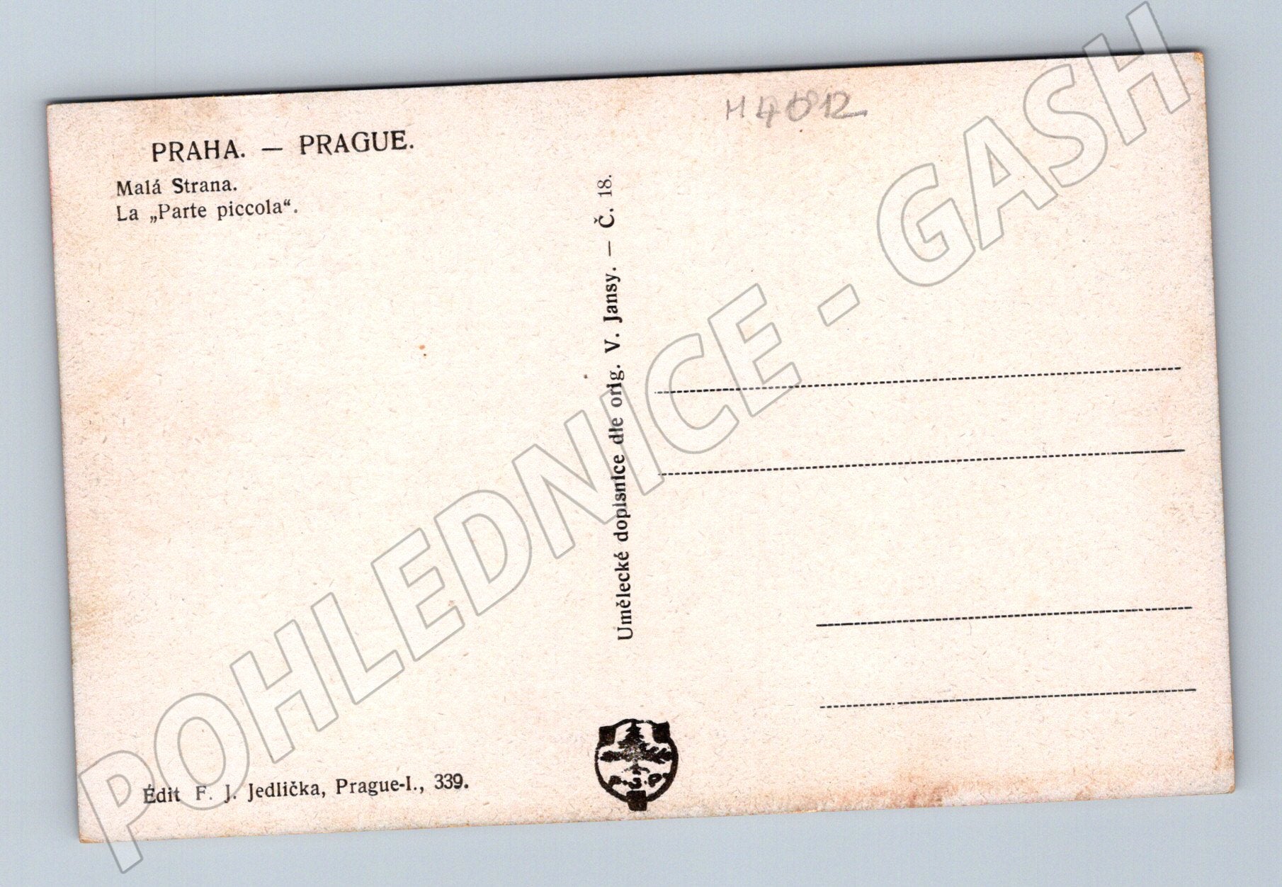 Krásná historická pohlednice s motivem Malé Strany v Praze. Na přední straně je umělecké vyobrazení pohledu na staré pražské střechy se Siluetou Pražského hradu v pozadí. Zadní strana dokládá, že se jedná o uměleckou dopisnici podle originálu V. Jansy, vydanou nakladatelstvím F. J. Jedlička v Praze. Pohlednice nebyla použita a je ve velmi dobrém stavu, vhodná pro sběratele pohlednic s Prahou či sběratele historických pohlednic obecně.