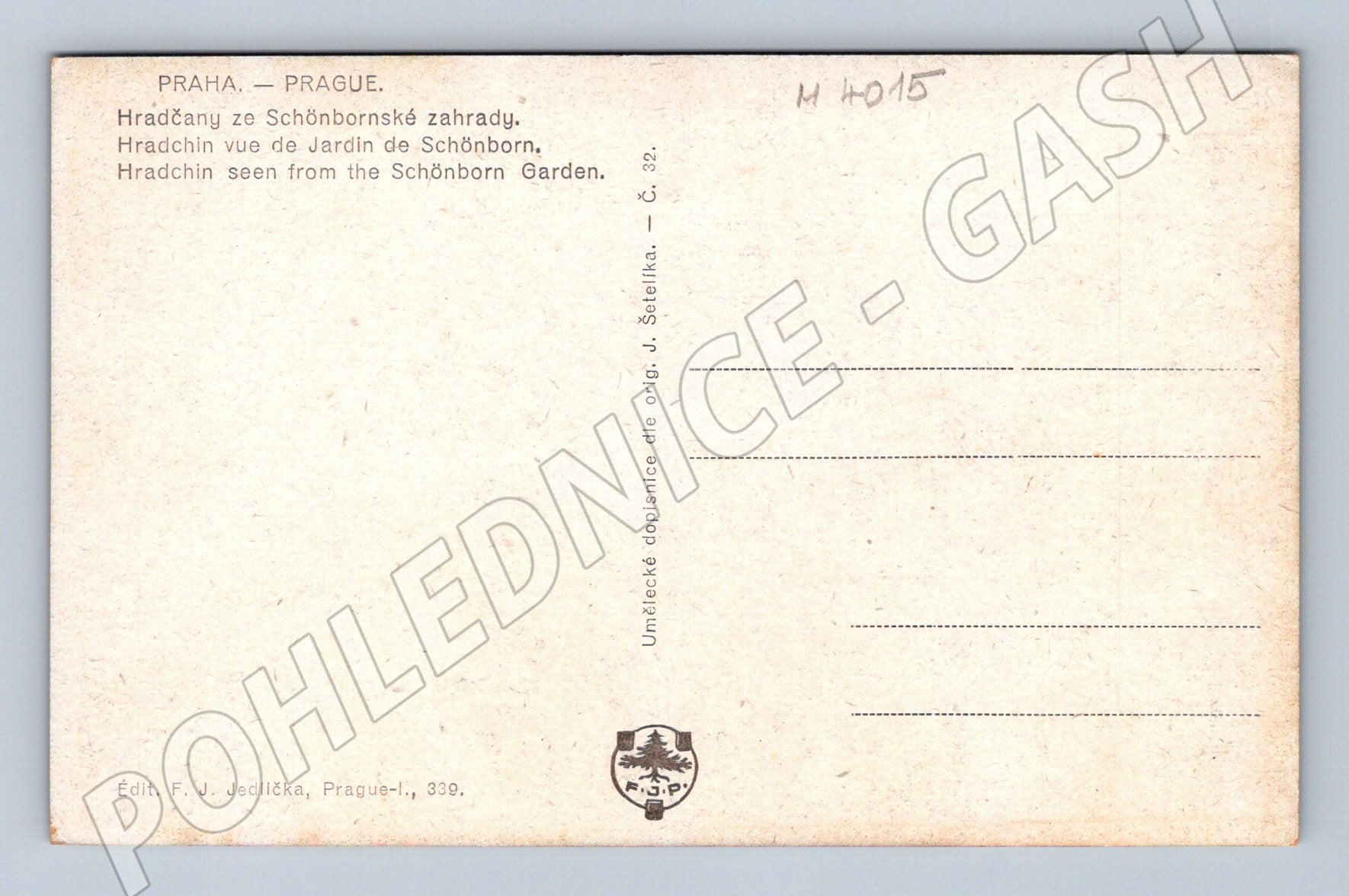 Starší pohlednice s pohledem na pražské Hradčany ze Schönbornské zahrady. Na fotografii je zachycen ikonický panoramatický pohled na Pražský hrad a jeho okolí, jak je viditelný ze zahrad Schönbornského paláce. Pohlednice je nepopsaná, s textem ve více jazycích (čeština, němčina, francouzština, angličtina) na zadní straně. Edice: F. J. Jedlička, Praha. Vhodné pro sběratele pohlednic s motivem Prahy, historických památek i milovníky starých pohlednic. Stav viz foto, odpovídá stáří.