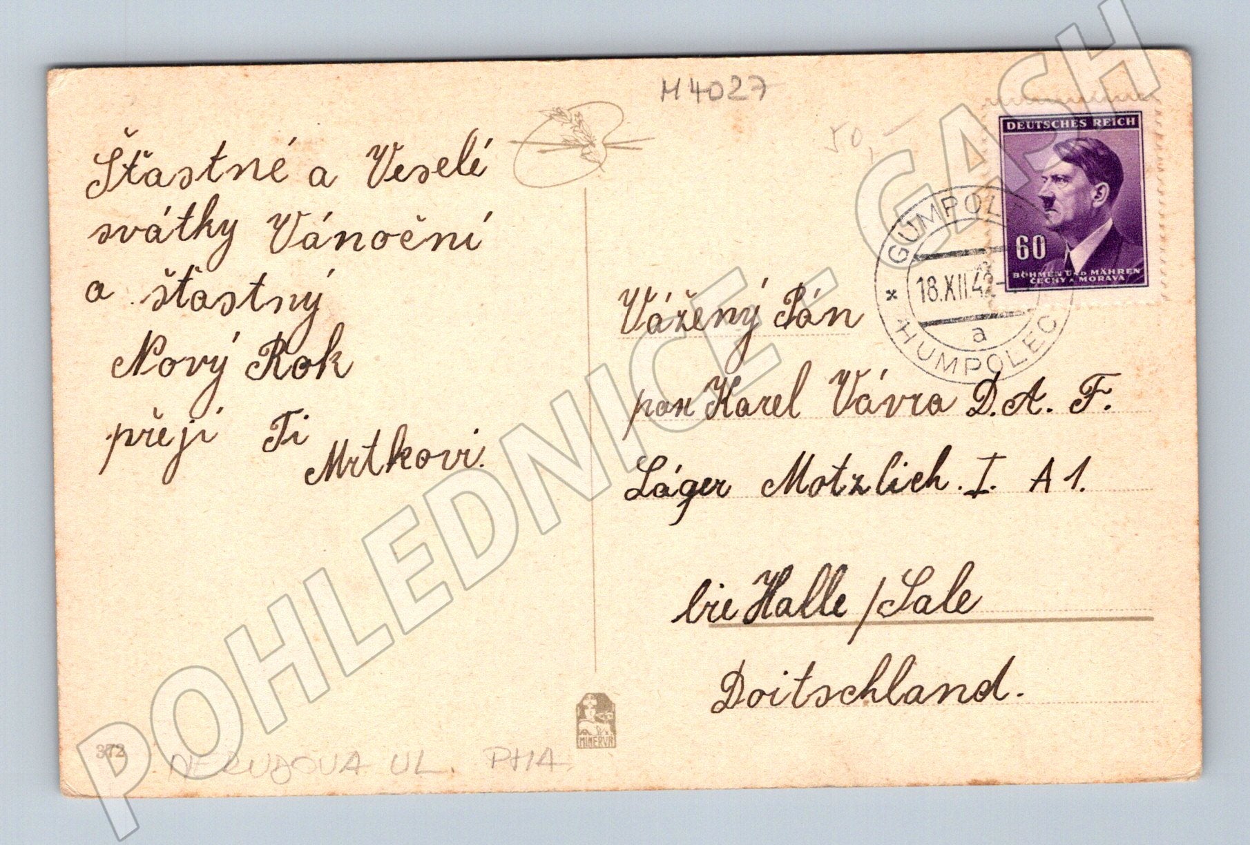 Vánoční pohlednice z období Protektorátu Čechy a Morava, s černobílou ilustrací zimní krajiny, nápisem Radostné svátky vánoční a přáním Pokoj lidem na zemi na přední straně. Na zadní straně ručně psané vánoční přání, známka s portrétem Adolfa Hitlera, a razítko s datem 18.XII.43 (1943). Pohlednice byla zaslána do Německa (Halle/Saale). Pohlednice nese stopy stáří a drobné opotřebení odpovídající svému věku. Sbírkově zajímavý artefakt z období druhé světové války.