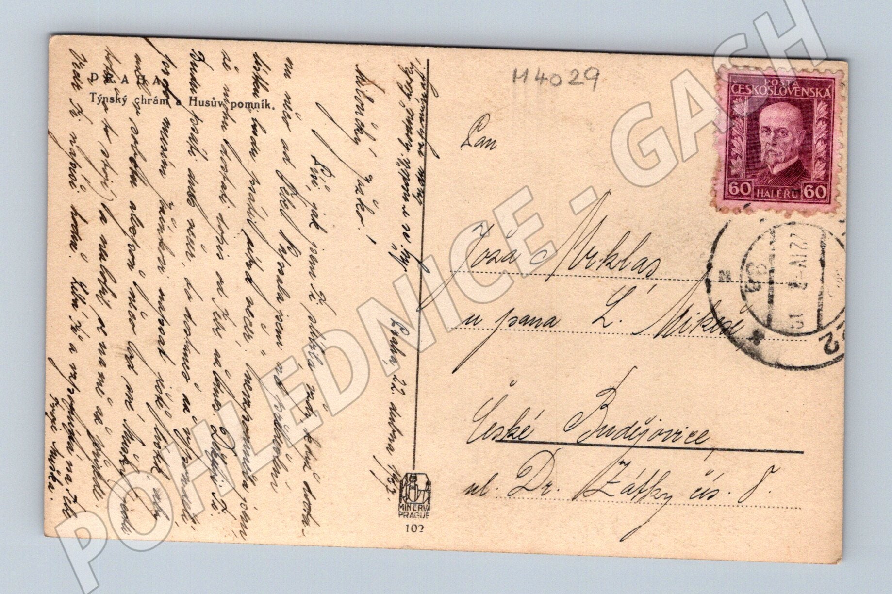 Originální stará pohlednice z období první poloviny 20. století, zobrazující Týnský chrám a Husův pomník na Staroměstském náměstí v Praze. Jedná se o černobílou fotografickou pohlednici orientovanou na šířku. Zadní strana je popsaná, opatřená známkou 60 haléřů s portrétem prezidenta T. G. Masaryka a poštovním razítkem. Pohlednice byla zaslána do Českých Budějovic. Na pohlednici jsou patrné historické detaily architektury a zajímavosti náměstí. Výborný sběratelský stav vzhledem ke stáří, rohy mírně otřelé, drobné známky užívání. Autentický doklad doby, vhodné pro sběratele i milovníky historie Prahy.