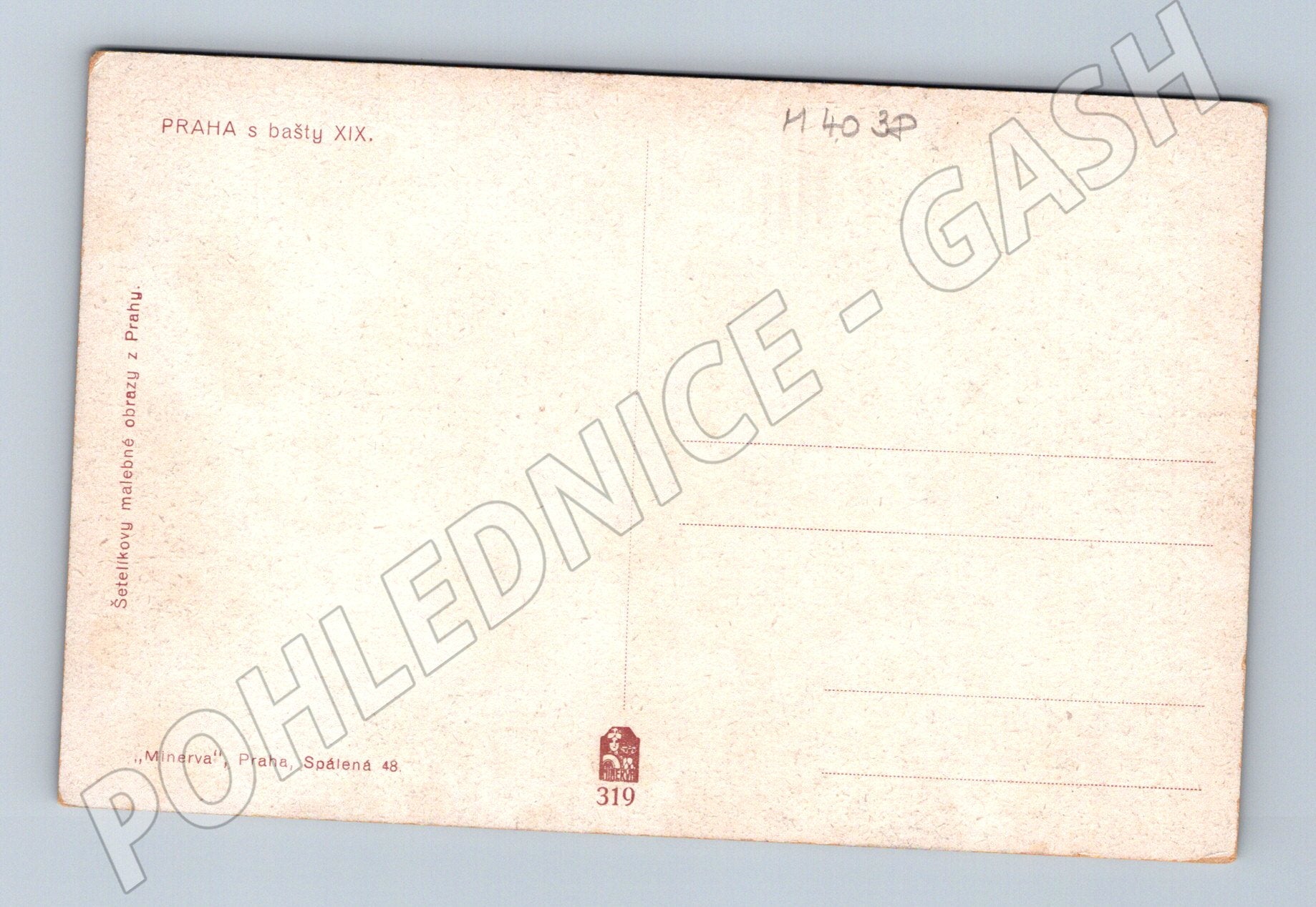 Starobylá pohlednice s motivem Prahy, pohled z bašty s výhledem na známé pražské mosty přes Vltavu. Na pohlednici je pěkně ilustrovaná historická část města s dominantami střech, zelení a mlhou zahalenými mosty v pozadí. Jedná se o pohlednici vyrobenou firmou Minerva Praha, Spálená 48. Na zadní straně je popis PRAHA s bašty XIX a informace o autorovi. Pohlednice není použita, velmi dobrý sběratelský stav. Skvělý doplněk pro sběratele starých pohlednic i milovníky Prahy.