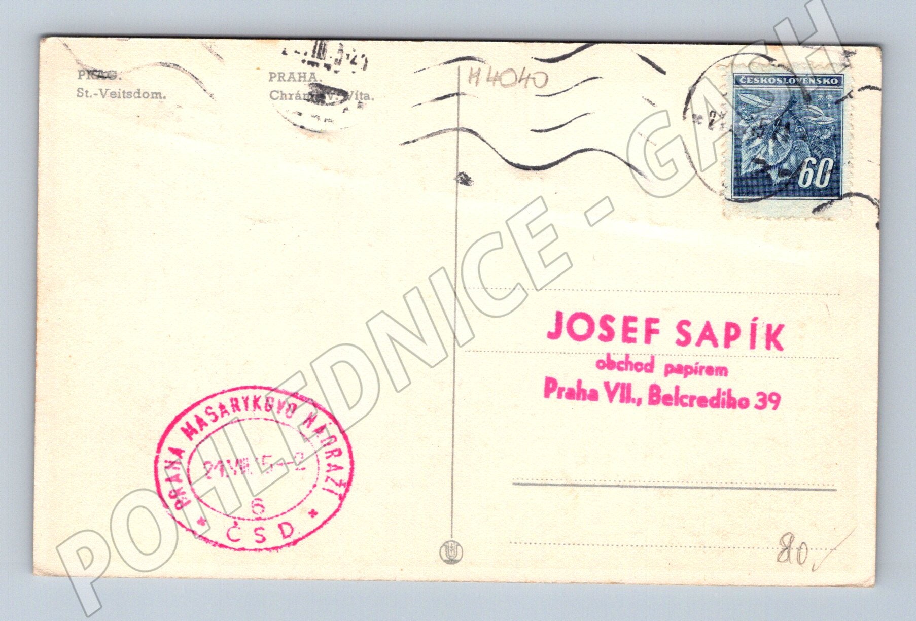 Originální stará pohlednice se zobrazením chrámu sv. Víta na Pražském hradě. Pohlednice je použita, opatřena razítkem Praha Masarykovo nádraží (ČSD) a poštovní známkou Československo 60 h. Na zadní straně je reklamní otisk obchodu Josef Sapík, Praha VII., Belcrediho 39. Stav pohlednice viz foto – známky běžného opotřebení, drobné skvrnky a zašpinění v rozích, jinak dobrý sběratelský stav. Krásný historický pohled na dominantu Prahy.