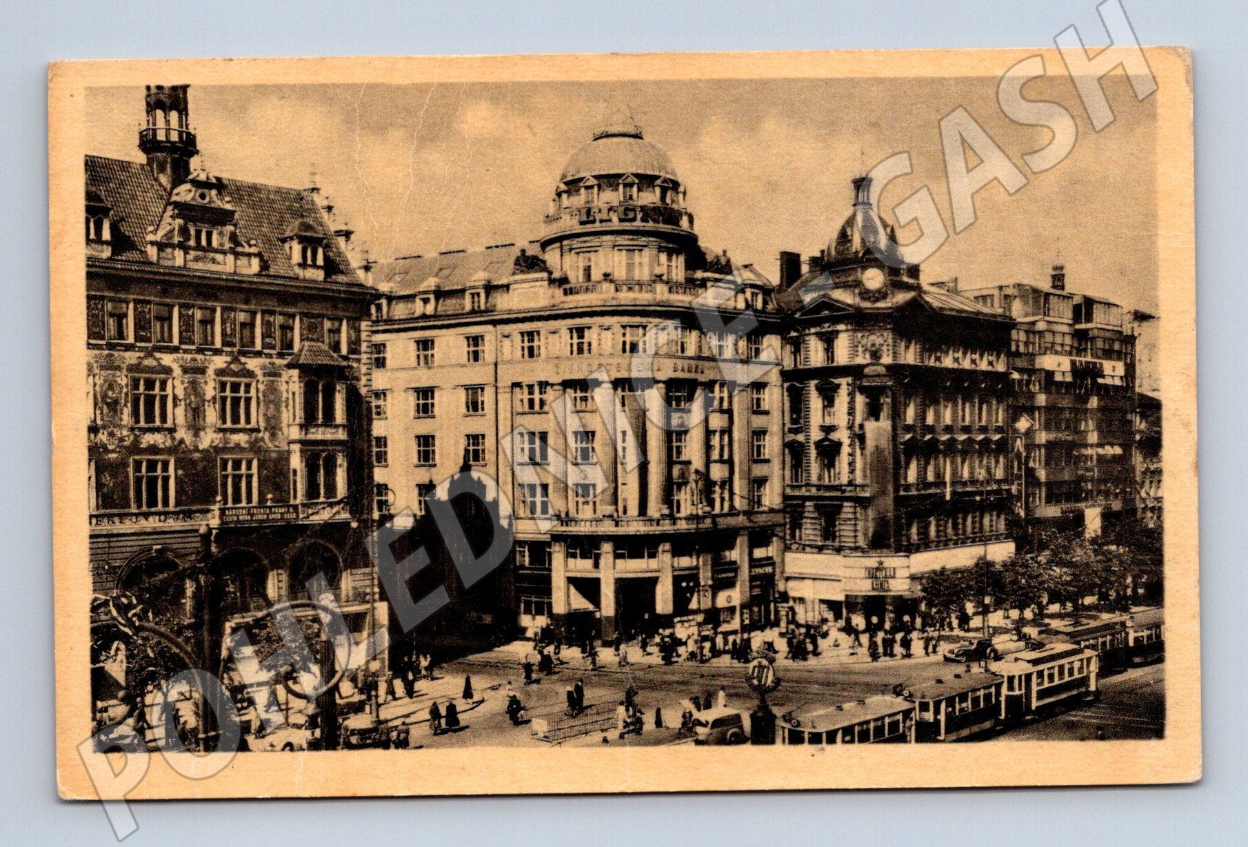Starobylá pohlednice s černobílým motivem Václavského náměstí v Praze. Na přední straně je detailní pohled na historické budovy a tramvaje v centru slavného pražského náměstí, zachycující jedinečnou atmosféru první poloviny 20. století. Zadní strana pohlednice je potištěná rukou psaným vzkazem, datována 20. 9. 1951, a obsahuje dobovou známku Československo s motivem traktoru. Skvělý sběratelský kousek dokumentující život a architekturu Prahy v minulosti.