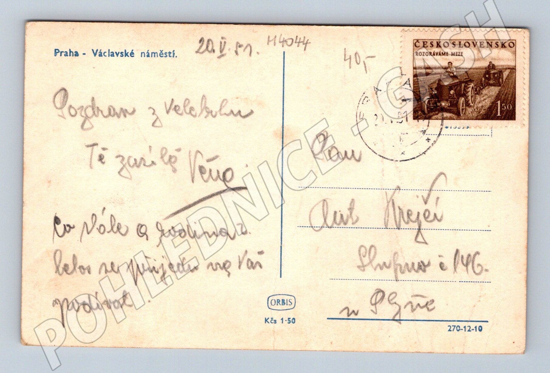 Praha Václavské náměstí – pohlednice 1951, poštou prošlá