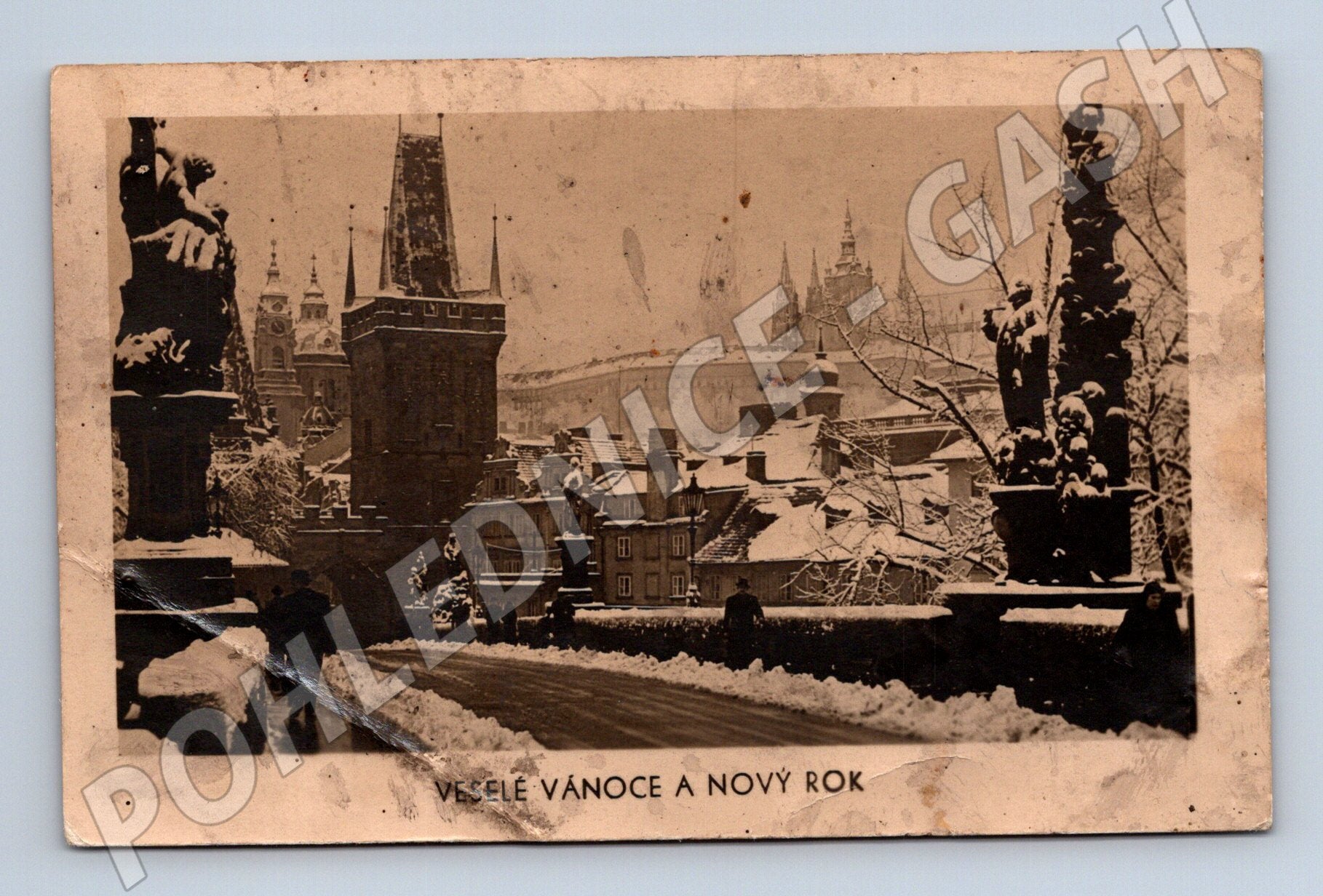 Originální stará pohlednice s vánočním a novoročním motivem z Prahy. Na přední straně je zachycena zimní scenérie Karlova mostu s pohledem na Hradčany, sněhem pokrytá Praha. Ve spodní části pohlednice je nápis Veselé Vánoce a Nový rok . Zadní strana obsahuje rukopisné věnování, známku z období Protektorátu Čechy a Morava (Deutsches Reich, 60h) a poštovní razítko z roku 1944. Pohlednice je ve sběratelsky zajímavém stavu, nese známky opotřebení, drobné ohyby a zašpinění, což odpovídá stáří. Zajímavý kousek pro milovníky historie Prahy nebo sběratele poštovní historie.
