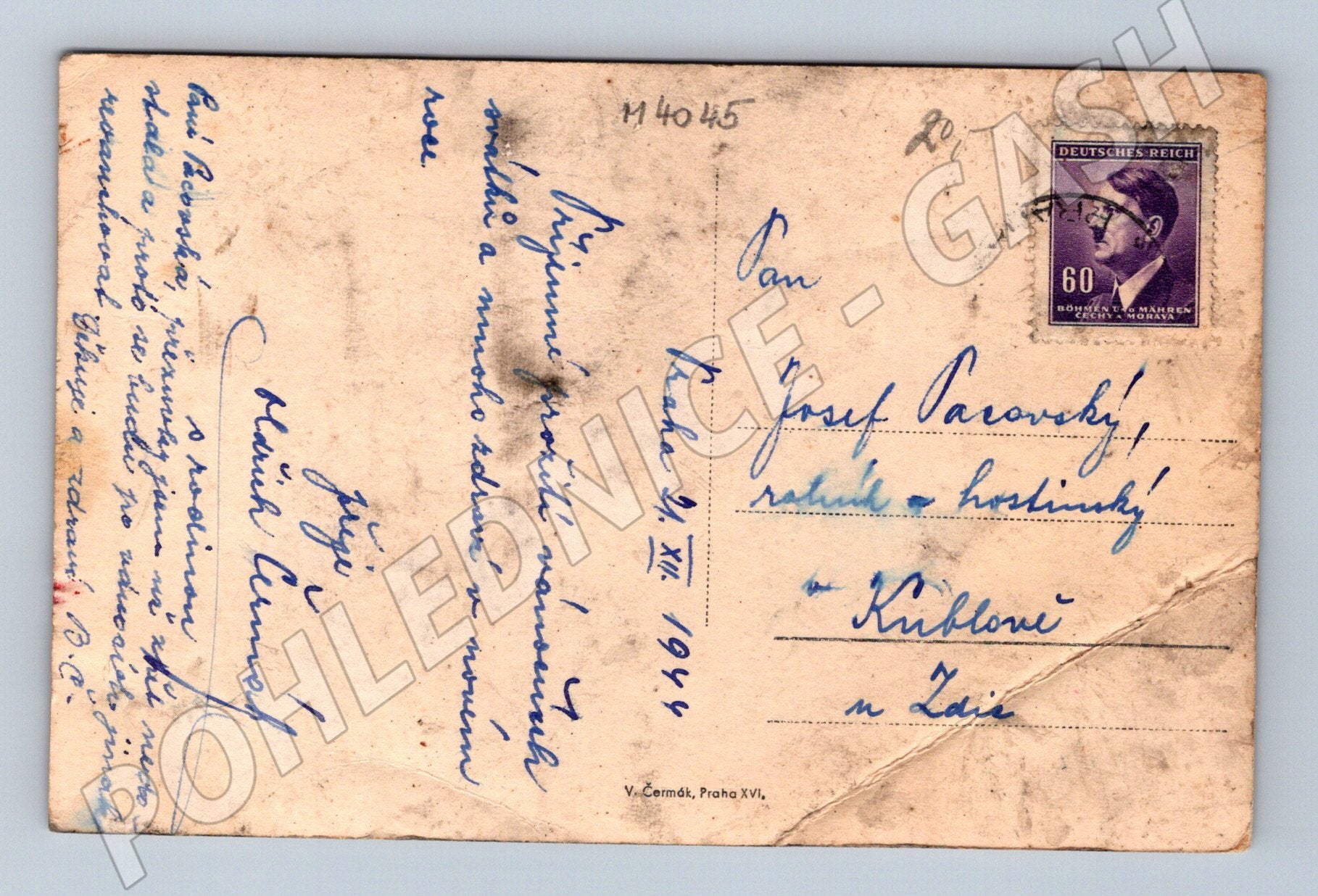 Praha Karlův most – zimní pohlednice, Veselé Vánoce, 1944, protektorátní známka