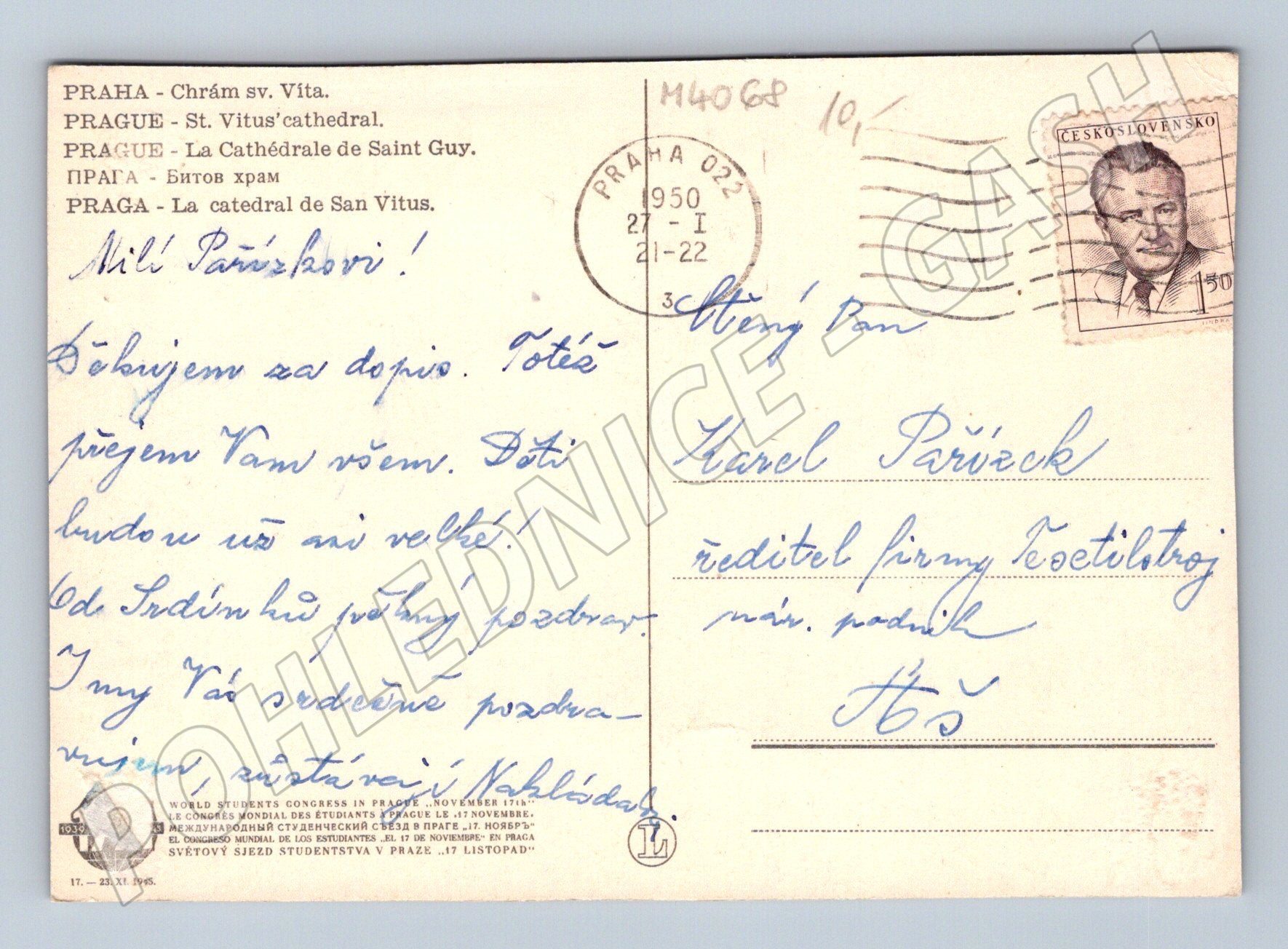 Originální černobílá pohlednice s vyobrazením Chrámu sv. Víta v Praze na Hradčanském nádvoří. Pohlednice je zaslaná roku 1950, což potvrzuje poštovní razítko a známka s portrétem. Na zadní straně je ručně psaný osobní vzkaz. Pohlednice je ve velmi dobrém sběratelském stavu s mírnými známkami opotřebení v rozích. Atraktivní historický motiv významné pražské památky je vhodný do každé sbírky, zvláště pro zájemce o Prahu a českou architekturu.