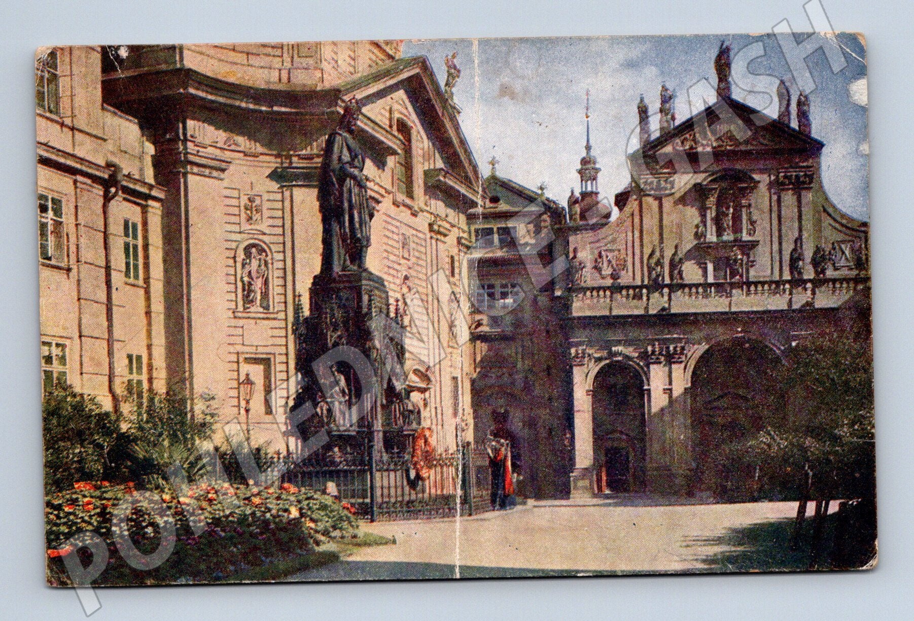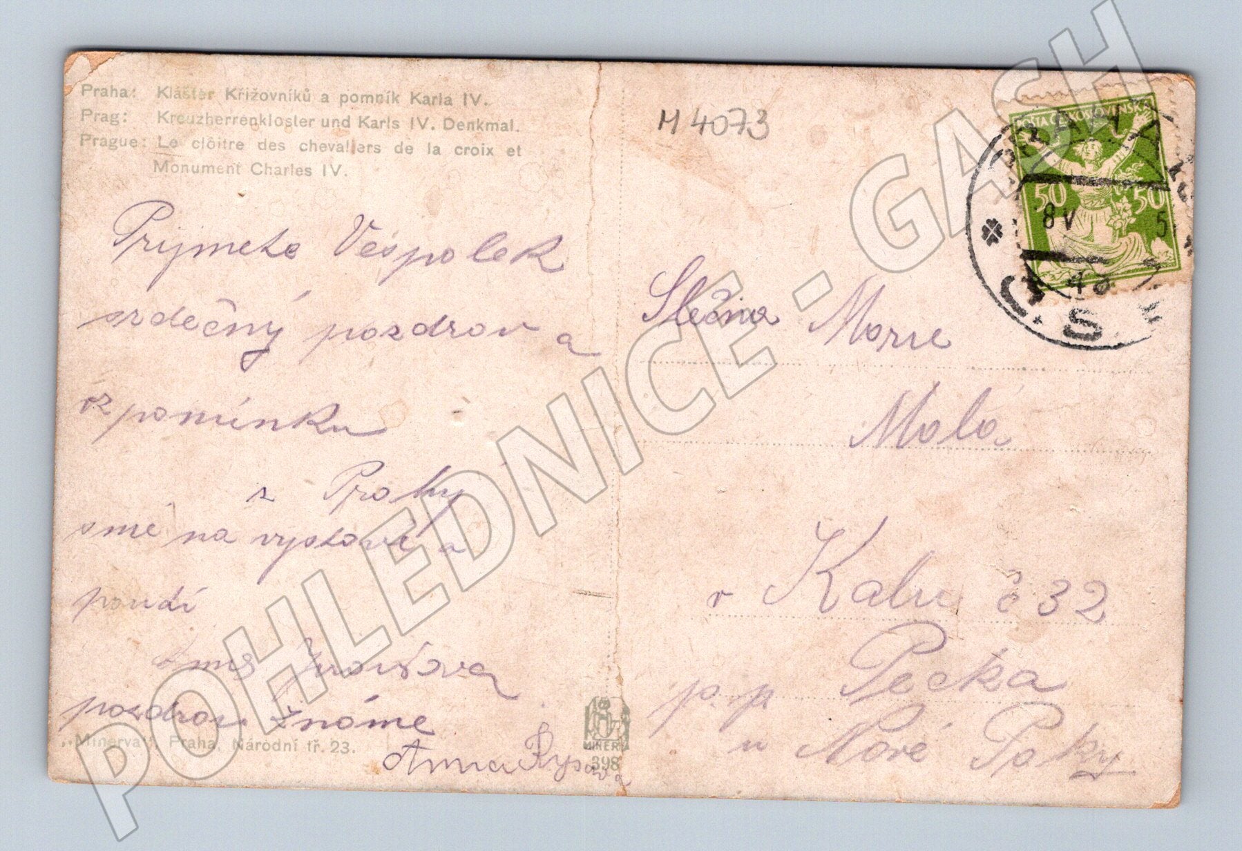 Stará pohlednice Praha – Klášter křížovníků a pomník Karla IV., zaslaná, známka, 1. republika