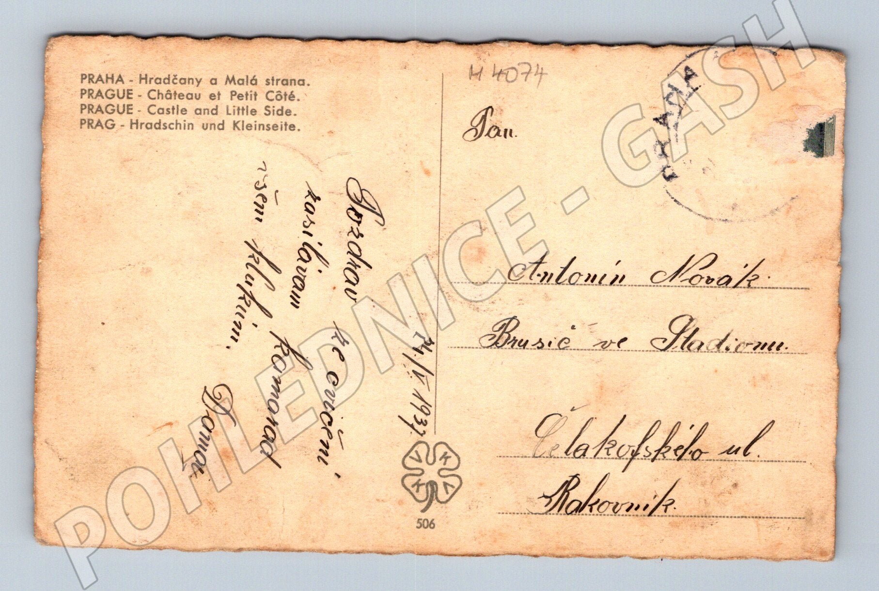Nabízím historickou pohlednici s pohledem na Pražský hrad a Malou Stranu v Praze. Pohlednice je ve formátu malého formátu a pochází z období před rokem 1950. Na pohlednici je vyobrazen ikonický pohled na katedrálu sv. Víta a okolní části Hradčan, Vltava a most na pozadí. Pohled je doplněn popisem v několika jazycích (čeština, francouzština, angličtina, němčina). Zadní strana obsahuje ručně psaný vzkaz, razítko a známku, což podtrhuje autentičnost a sběratelskou hodnotu pohlednice. Stav odpovídá stáří - zažloutnutí, lehké opotřebení a stopy používání. Ideální přírůstek do sbírky starých pohlednic s motivy Prahy.