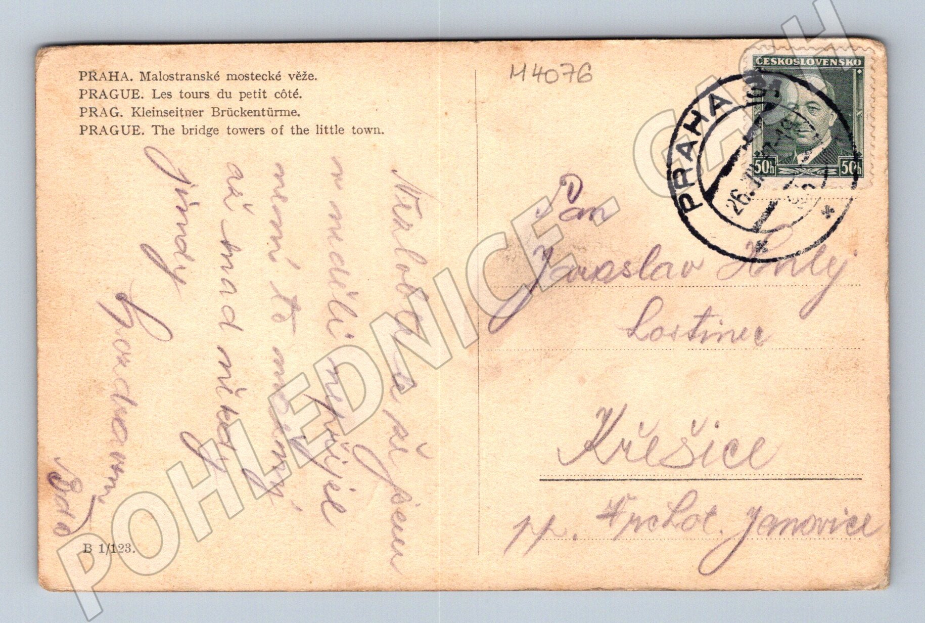 Starší pohlednice z období první poloviny 20. století s motivem Malostranské mostecké věže v Praze. Pohlednice zobrazuje malebný výhled na Karlův most, historické věže a Pražský hrad v pozadí. Na zadní straně je ručně psaný text, adresovaná panu Jaroslavu Hulovi do Křešic, opatřena poštovní známkou a razítkem s datem odeslání z Prahy. Pohlednice nese typické známky stáří – lehké opotřebení a patinu. Cenný sběratelský kousek dokumentující atmosféru a architekturu staré Prahy.