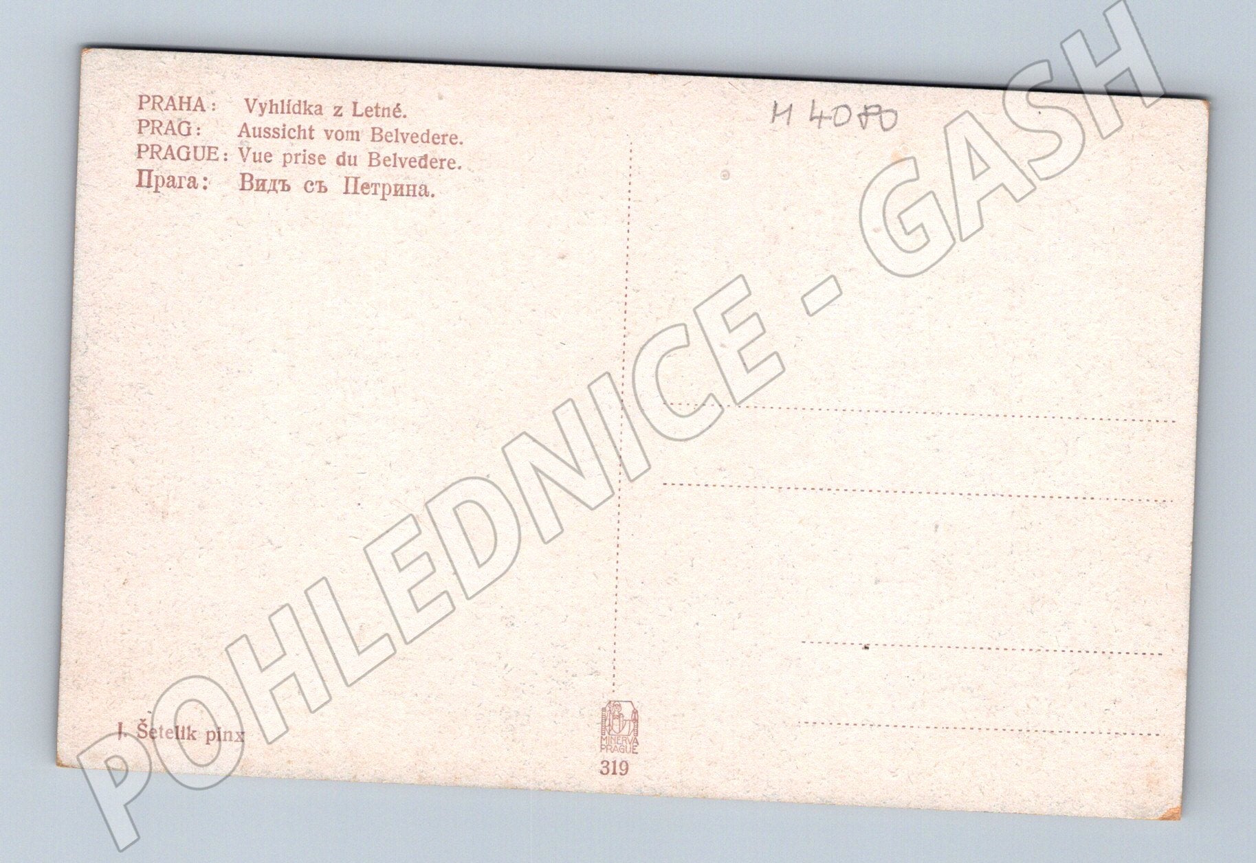 Unikátní historická pohlednice s motivem Prahy – vyhlídka z Letné. Pohlednice zobrazuje nádherný výhled na pražské střechy, věž a ikonický Karlův most v mlhavém pozadí, podle malby J. Šetlíka. Na zadní straně je označení v pěti jazycích (česky, německy, francouzsky, rusky a anglicky) a vydavatelská značka. Jedná se o malý formát a sběratelsky cenný pohled, který nebyl vyplněn ani odeslán. Skvělý kus pro sběratele historických pohlednic Prahy nebo milovníky výtvarného umění.