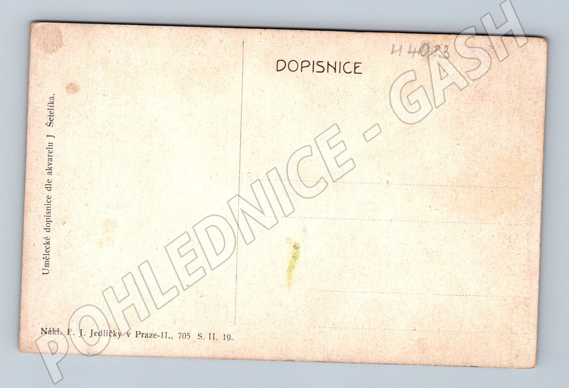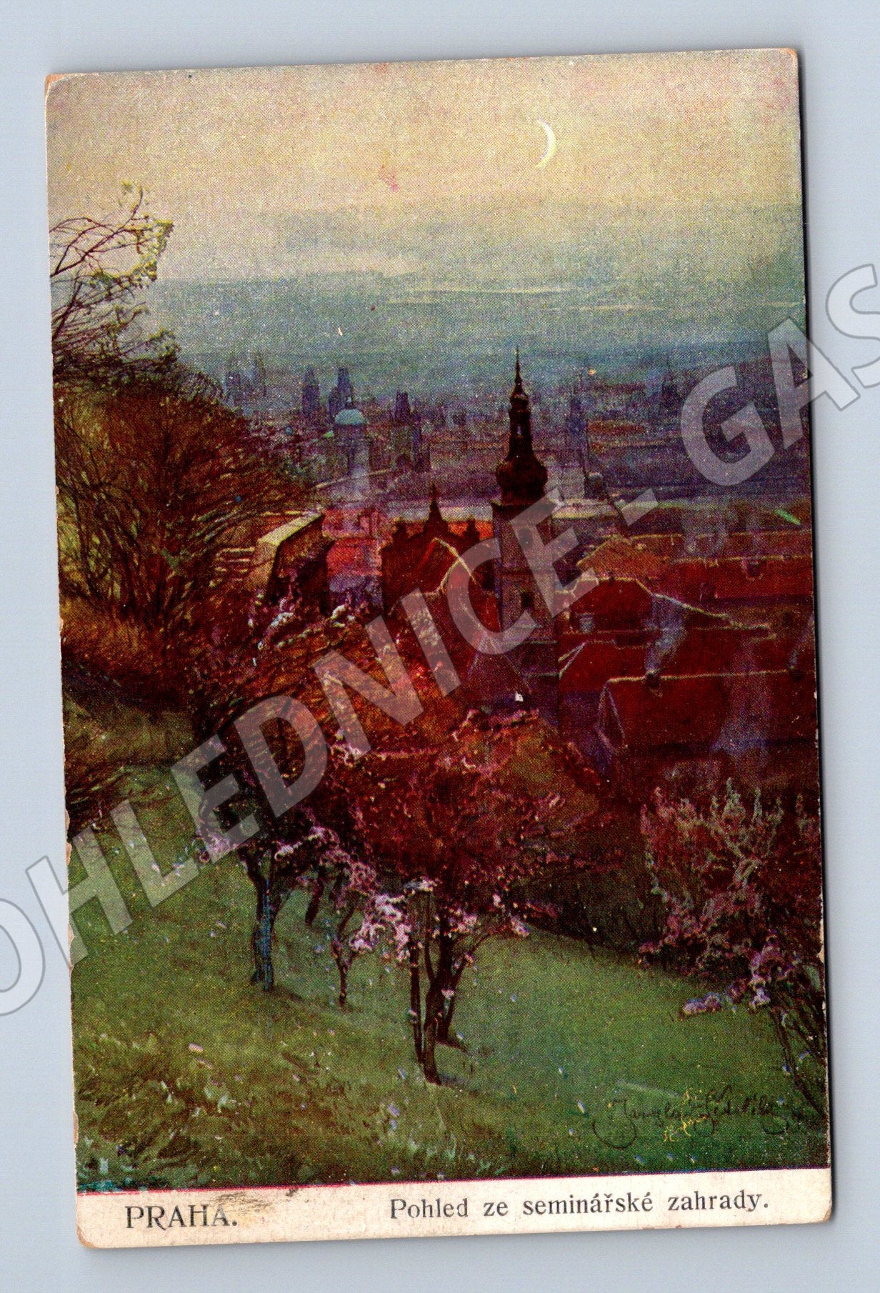 Historická pohlednice s motivem Prahy – pohled ze Seminářské zahrady podle akvarelu J. Šetelíka. Pohlednice zachycuje malebný výhled na Prahu s dominantou kostela a večerní atmosférou s měsíčkem na obzoru. Na rubu je označení Umělecká dopisnice dle akvarelu J. Šetelíka a vydavatelem je F. J. Jedlička, Praha II. Rok vydání pravděpodobně kolem počátku 20. století. Pohlednice nebyla prošlá poštou a je v dobrém sběratelském stavu. Vhodná pro sběratele historických pohlednic Prahy, uměleckých motivů nebo starých tisků.