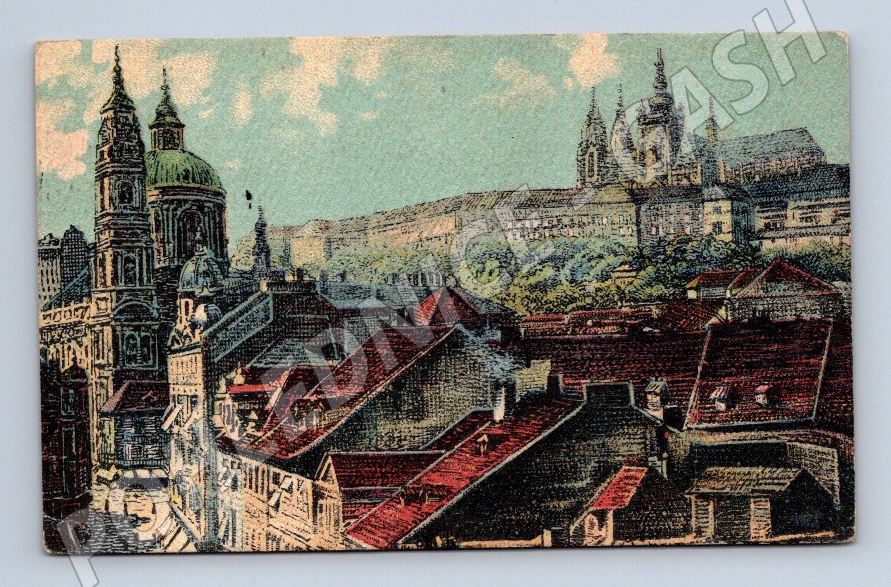 Starobylá pohlednice s vyobrazením Malé Strany a Hradčan v Praze. Na pohlednici naleznete kreslený pohled na dominanty Prahy – vlevo chrám sv. Mikuláše, v pozadí Pražský hrad a katedrála sv. Víta. Zajímavý barevný tisk s množstvím detailů budov, střech a historické atmosféry hlavního města. Pohlednice je použitá, na zadní straně je rukopisný text, adresa a poštovní známka ČSR s razítkem z roku 1927. Rozměr malého formátu, sběratelský kousek vhodný pro milovníky historie Prahy a starých pohlednic.