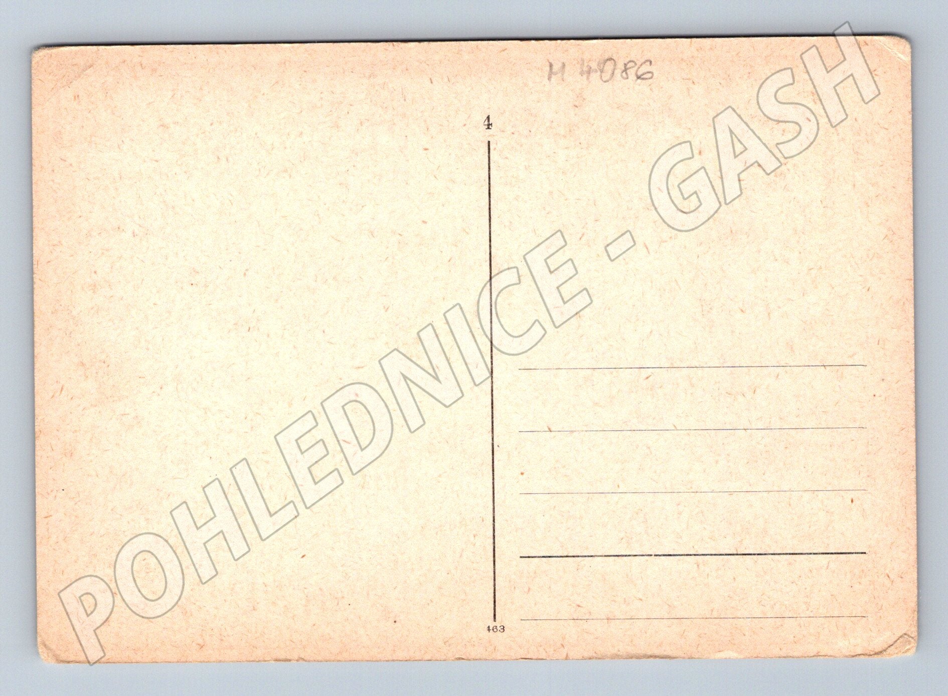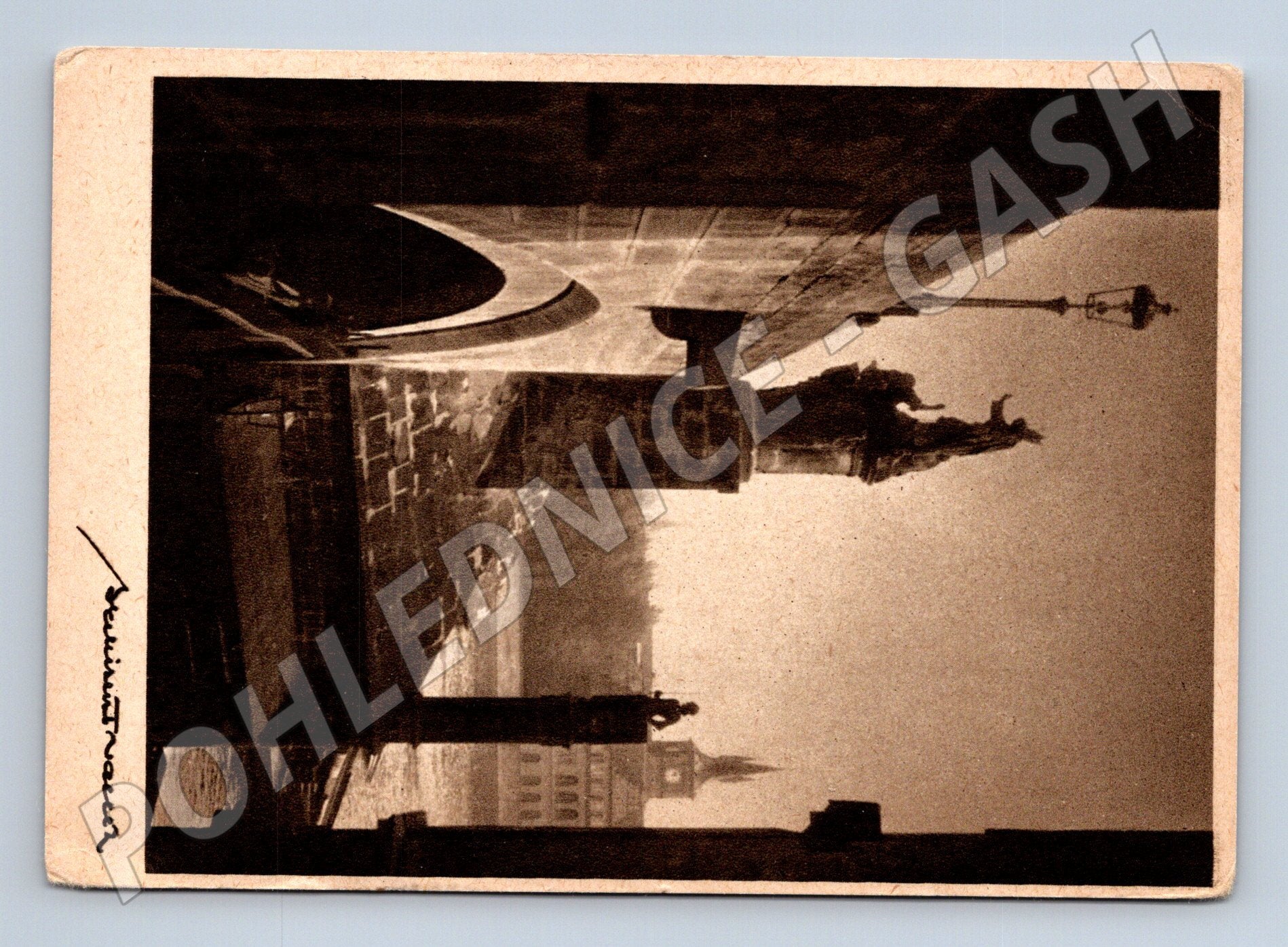 Starší černobílá pohlednice zachycující ikonickou část Karlova mostu v Praze s výraznými barokními sochami a lucernou v popředí. Na pozadí lze spatřit siluetu věží a pražských budov v mlhavém ranním nebo večerním osvětlení. Jedná se o malý formát pohlednice vydaný pravděpodobně před rokem 1950. Rubová strana je neprošlá a čistá, s jemnými známkami stáří. Ideální přírůstek do sbírky pražských nebo českých pohlednic.
