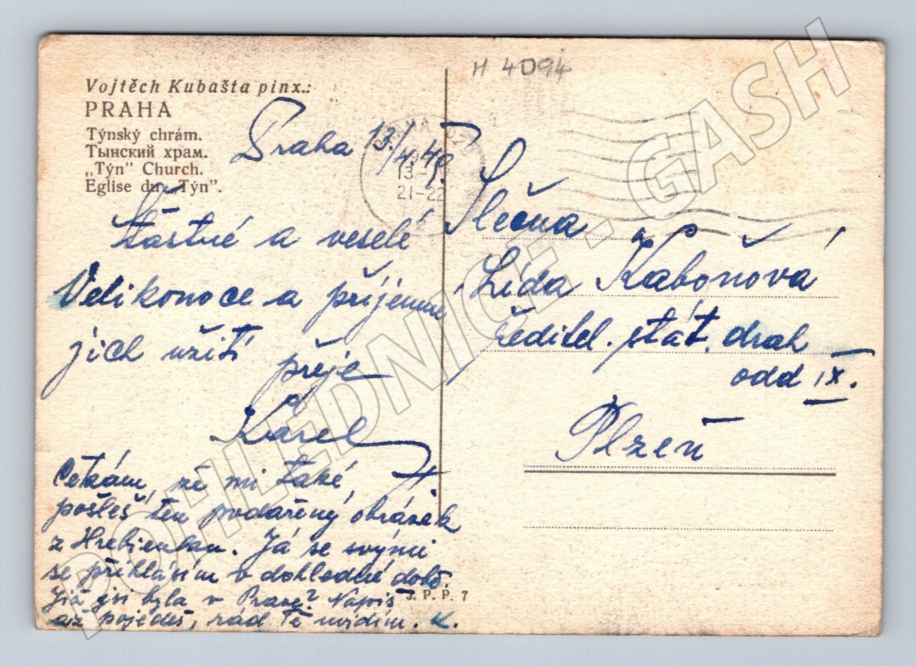 Starobylá pohlednice s malovaným motivem Staroměstského náměstí v Praze. Na obrázku je zachycena dominanta náměstí - Týnský chrám a Staroměstská radnice s orlojem. Jedná se o originální pohlednici z období první poloviny 20. století, autorem motivu je malíř Vojtěch Kubašta. Pohlednice byla zaslaná, opatřena známkami běžného opotřebení (viz foto), zadní strana s rukopisným textem a adresou v Plzni. Formát malý, velmi dekorativní a sběratelsky cenný kus, vhodný do sbírky historických pohlednic z Prahy.