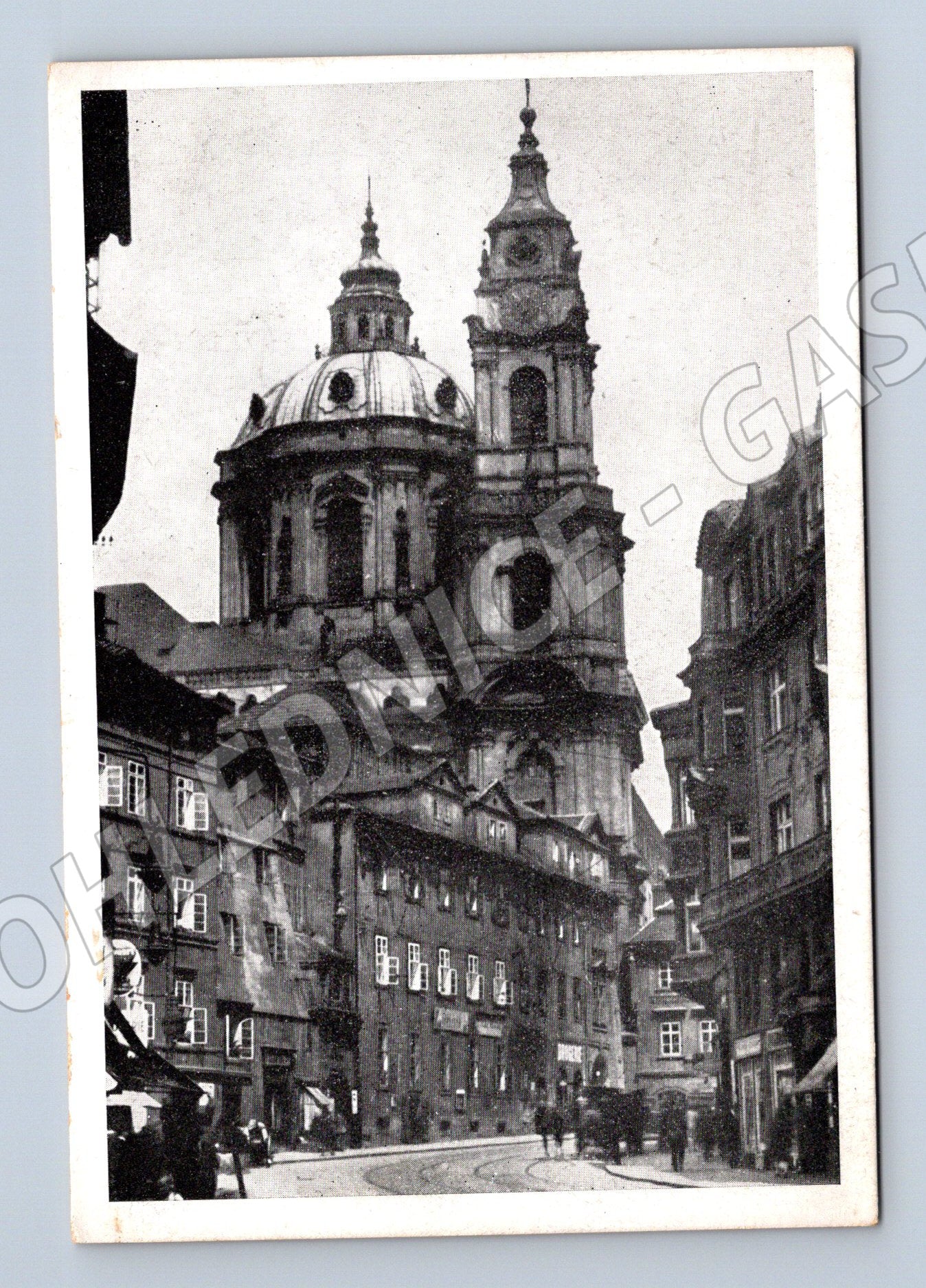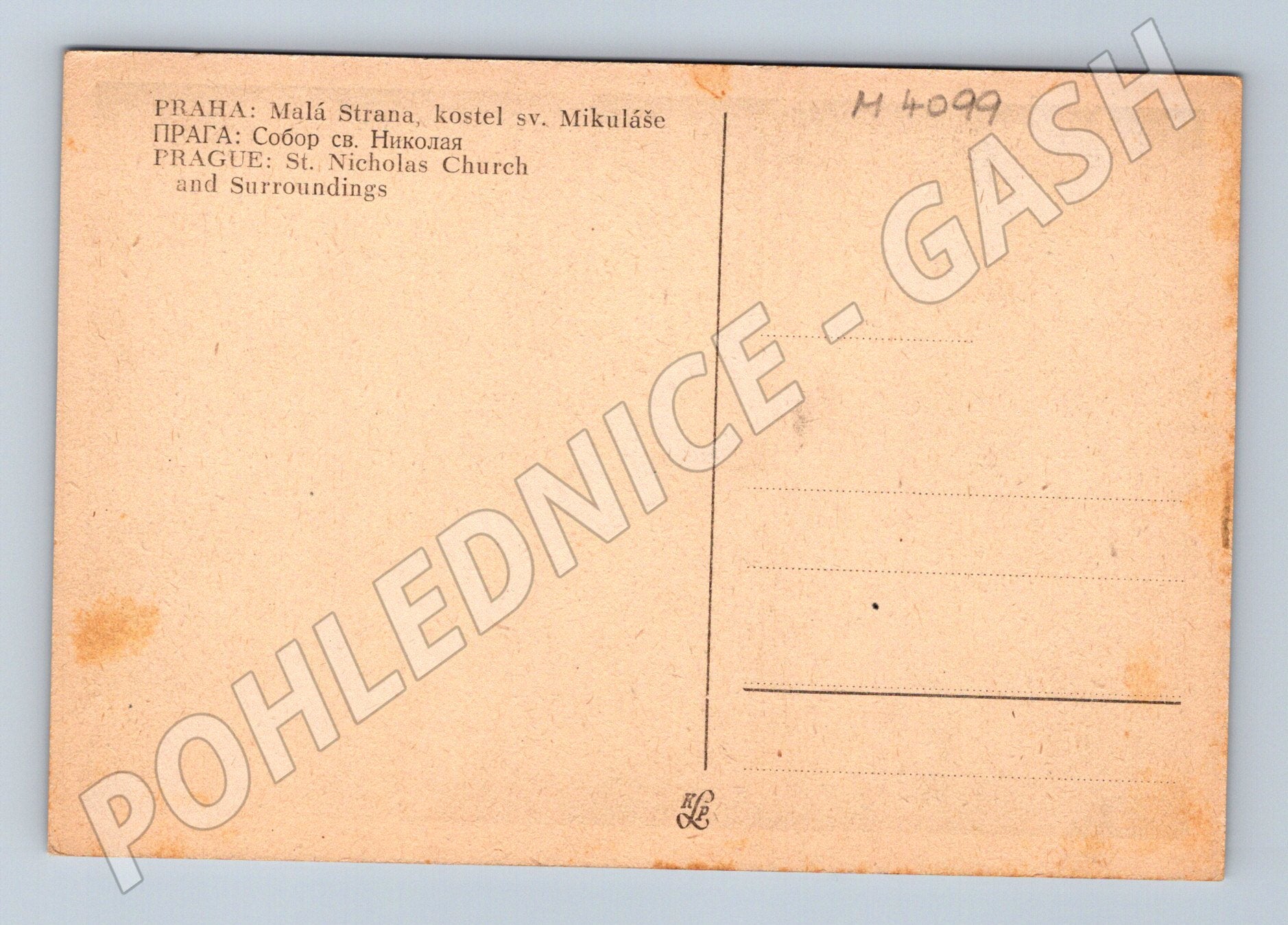 Starší černobílá pohlednice zachycující kostel sv. Mikuláše na Malé Straně v Praze, včetně okolní zástavby. Text na zadní straně pohlednice je v češtině, ruštině a angličtině: PRAHA: Malá Strana, kostel sv. Mikuláše / PRAGUE: St. Nicholas Church and Surroundings . Pohlednice má klasické rozvržení pro popis a adresu, nese drobné stopy stáří a skvrny, jinak v zachovalém sběratelském stavu. Zajímavý kousek pro sběratele historických pohlednic s motivem Prahy.