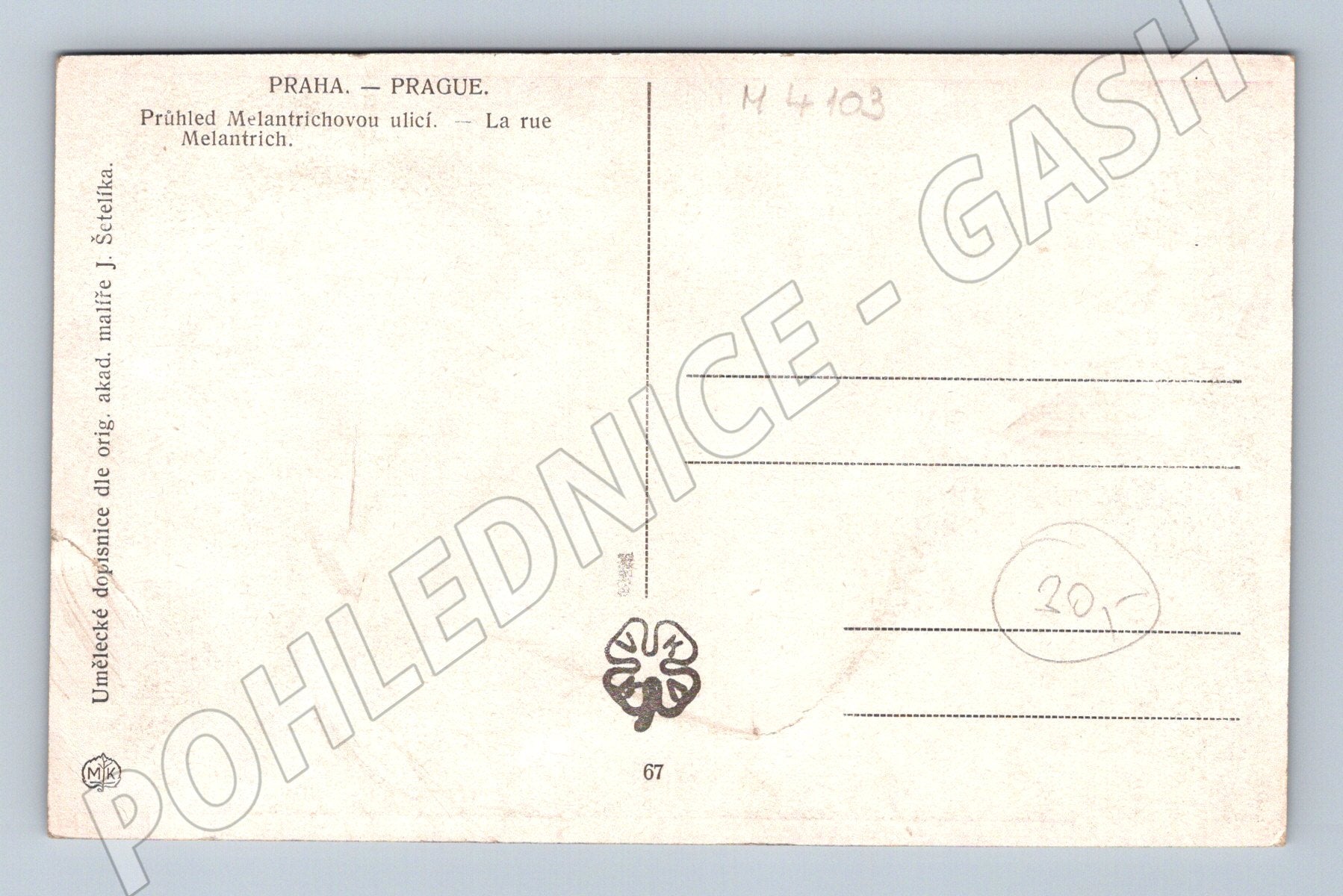 Starší umělecká pohlednice s pohledem na Melantrichovu ulici v Praze, vytištěná podle originálu malíře J. Šetlíka. Pohlednice zachycuje historické centrum města s typickou atmosférou Starého Města, v pozadí s věží a rušnou ulicí. Na zadní straně pohlednice je tištěný popis ve třech jazycích (česky, francouzsky, německy) a prostor pro adresu a známku. Vhodné pro sběratele historických pohlednic s motivem Prahy a pro milovníky umění.