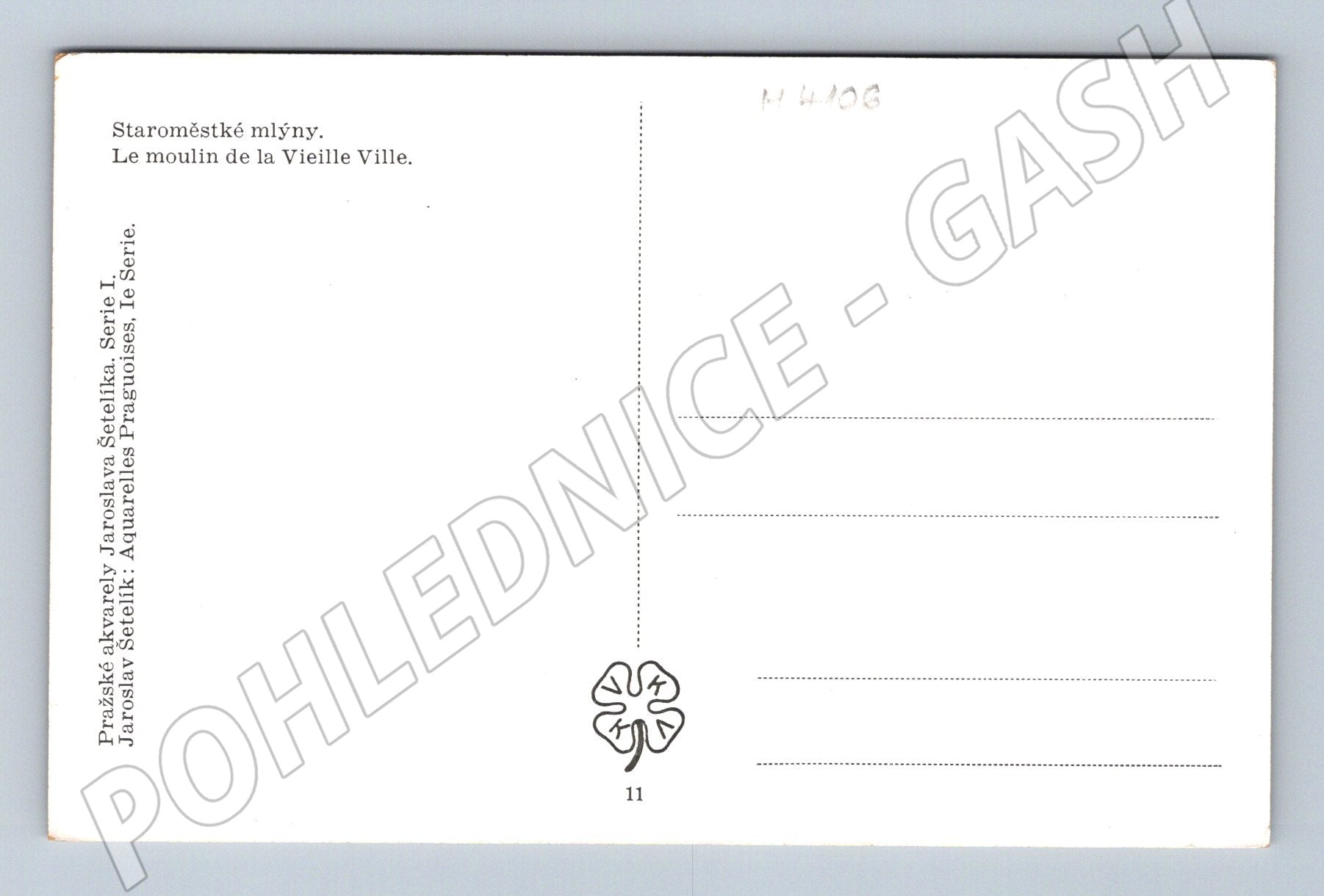 Nabízím originální starou pohlednici s názvem Staroměstské mlýny v Praze. Pohlednice je tištěna podle akvarelu Jaroslava Šetelíka, jedné z výrazných osobností českého výtvarného umění. Pohlednice zachycuje krásnou historickou scenérii pražského Starého Města s pohledem na Vltavu, mlýny a okolní architekturu. Na zadní straně je popis ve třech jazycích a standardní rozdělení pro adresu a zprávu. Pohlednice není použitá a je velmi dobře zachovalá. Ideální sběratelský kousek pro milovníky staré Prahy a českých pohlednic.