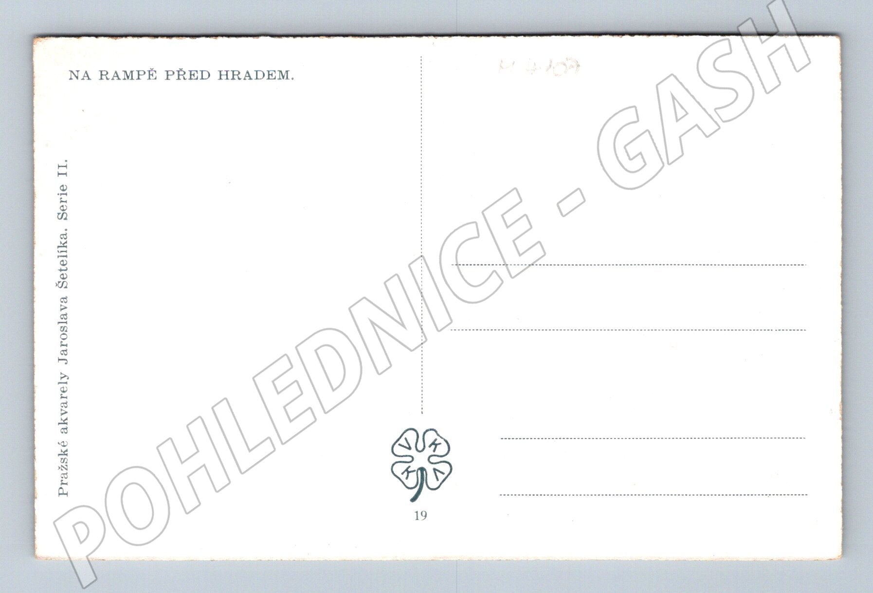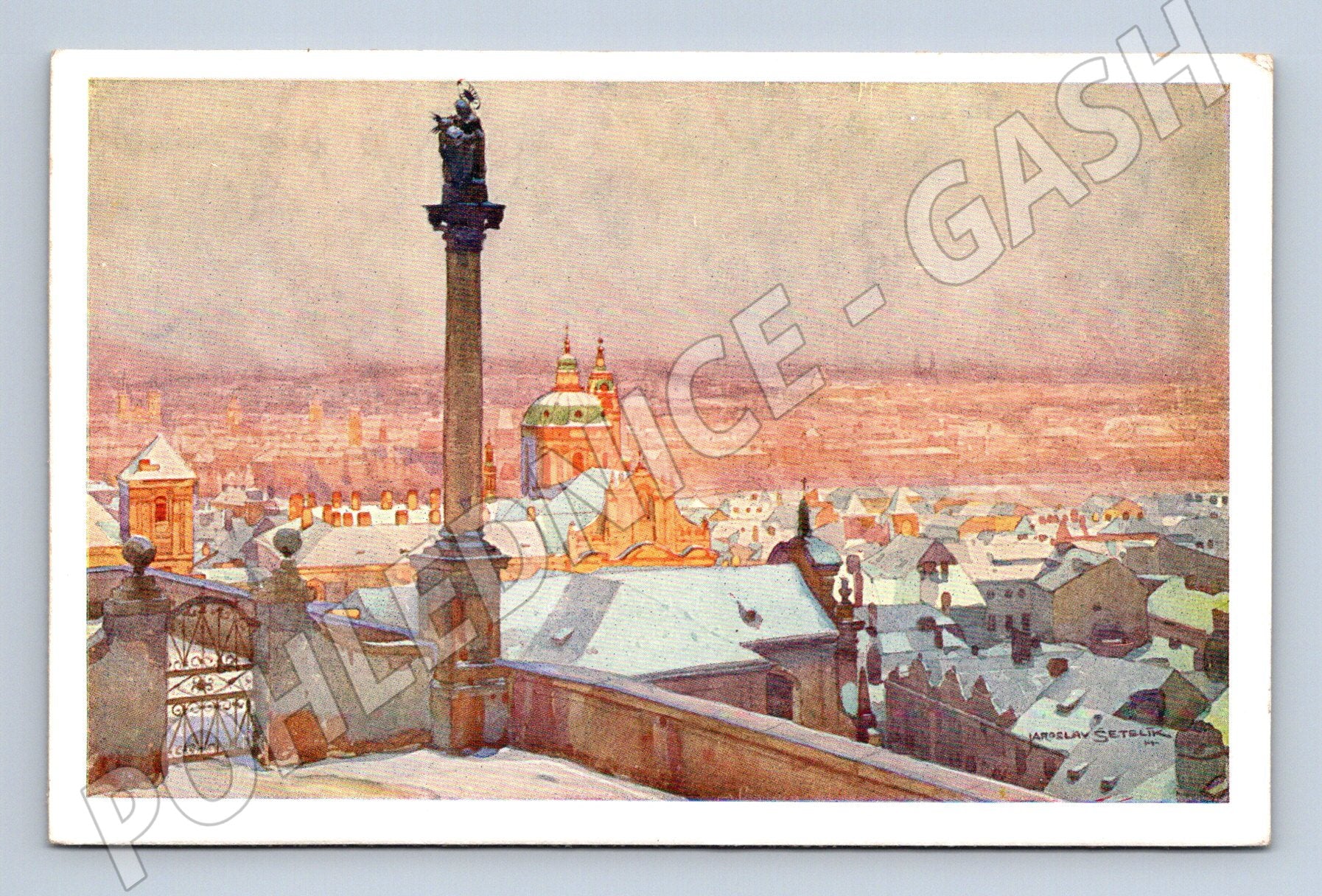 Nabízím originální pohlednici s motivem rampy před Pražským hradem, inspirovanou akvarelem malíře Jaroslava Šetelíka (Pražská akvarely Jaroslava Šetelíka, Série II). Pohlednice zachycuje zimní pohled na chrám sv. Víta a jeho okolí, se sochou Panny Marie na Mariánském sloupu v popředí. Na zadní straně pohlednice je tištěný popis NA RAMPĚ PŘED HRADEM . Pohlednice je neprošlá a ve velmi dobrém sběratelském stavu. Skvělý přírůstek do sbírky historických pohlednic Prahy z první poloviny 20. století.
