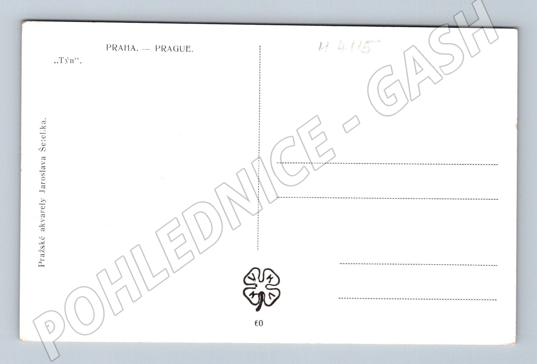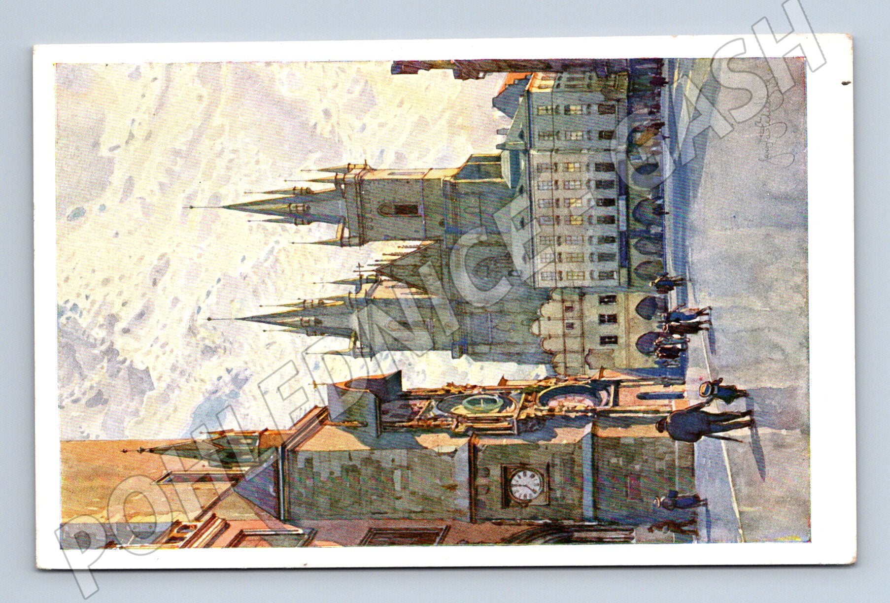 Originální pohlednice z edice Pražské akvarely Jaroslava Šetelíka. Na pohlednici je malebně zachycen pohled na Staroměstské náměstí v Praze s výraznými dominantami Týnského chrámu a Staroměstské radnice s orlojem. Pohlednice je neprošlá, ve velmi pěkném stavu, bez popisu, ideální pro sběratele nebo jako dárek. Rozměr odpovídá tradičnímu malému formátu vydávanému do roku 1950. Jedná se o zajímavý sběratelský kousek s uměleckou hodnotou, který vystihuje historické kouzlo Prahy.