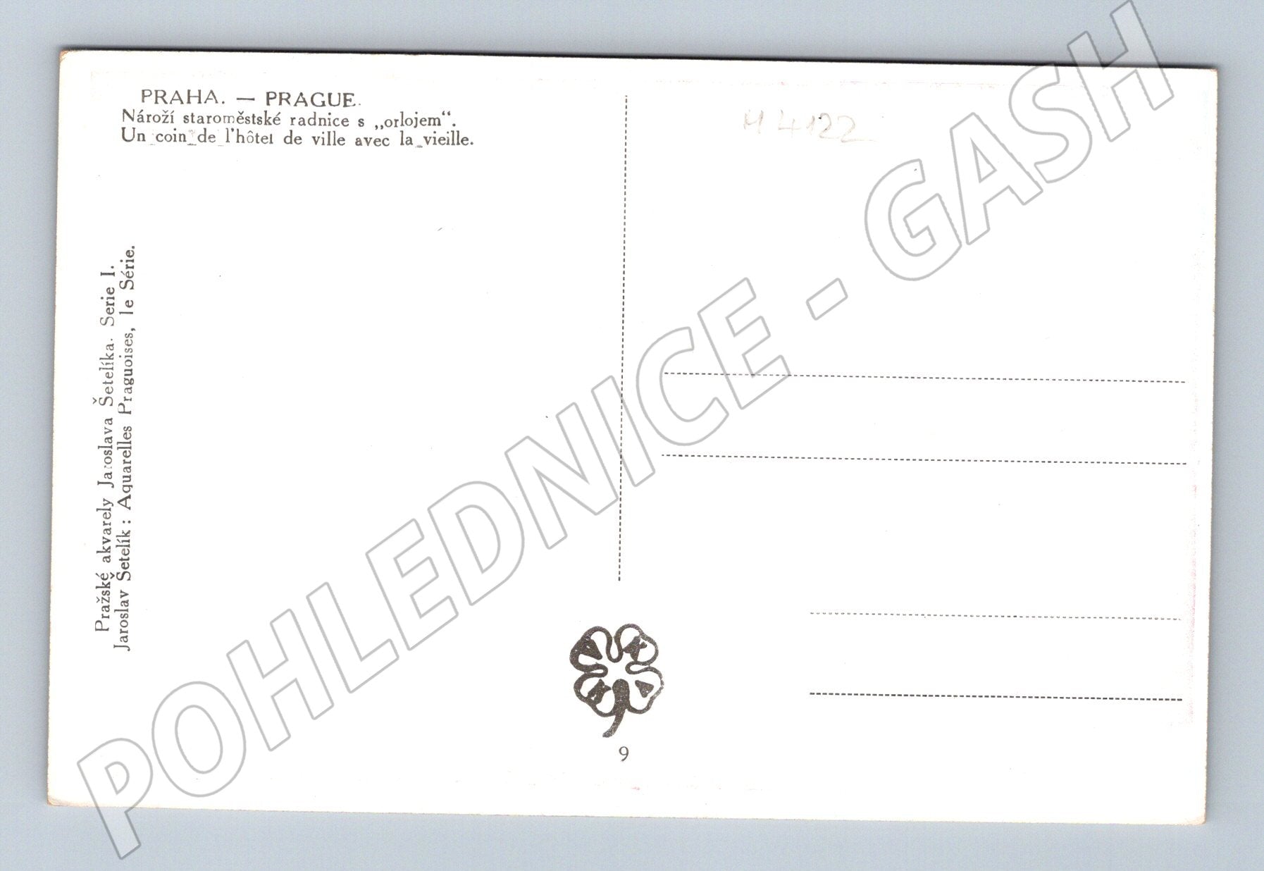 Originální stará pohlednice s motivem nároží Staroměstské radnice v Praze a slavného orloje. Akvarel Jaroslav Šetelík, pohled odkazuje na pražský unikát zachycený uměleckým způsobem. Text na zadní straně v češtině a francouzštině, určeno ke korespondenci. Pohlednice je ve velmi dobrém stavu, bez známky užití, původní čistý rub. Ideální sběratelský kus pro milovníky Prahy, historických památek a výtvarného umění. Malý formát, vydání cca před rokem 1950. Vhodné do sbírky historických pohlednic.