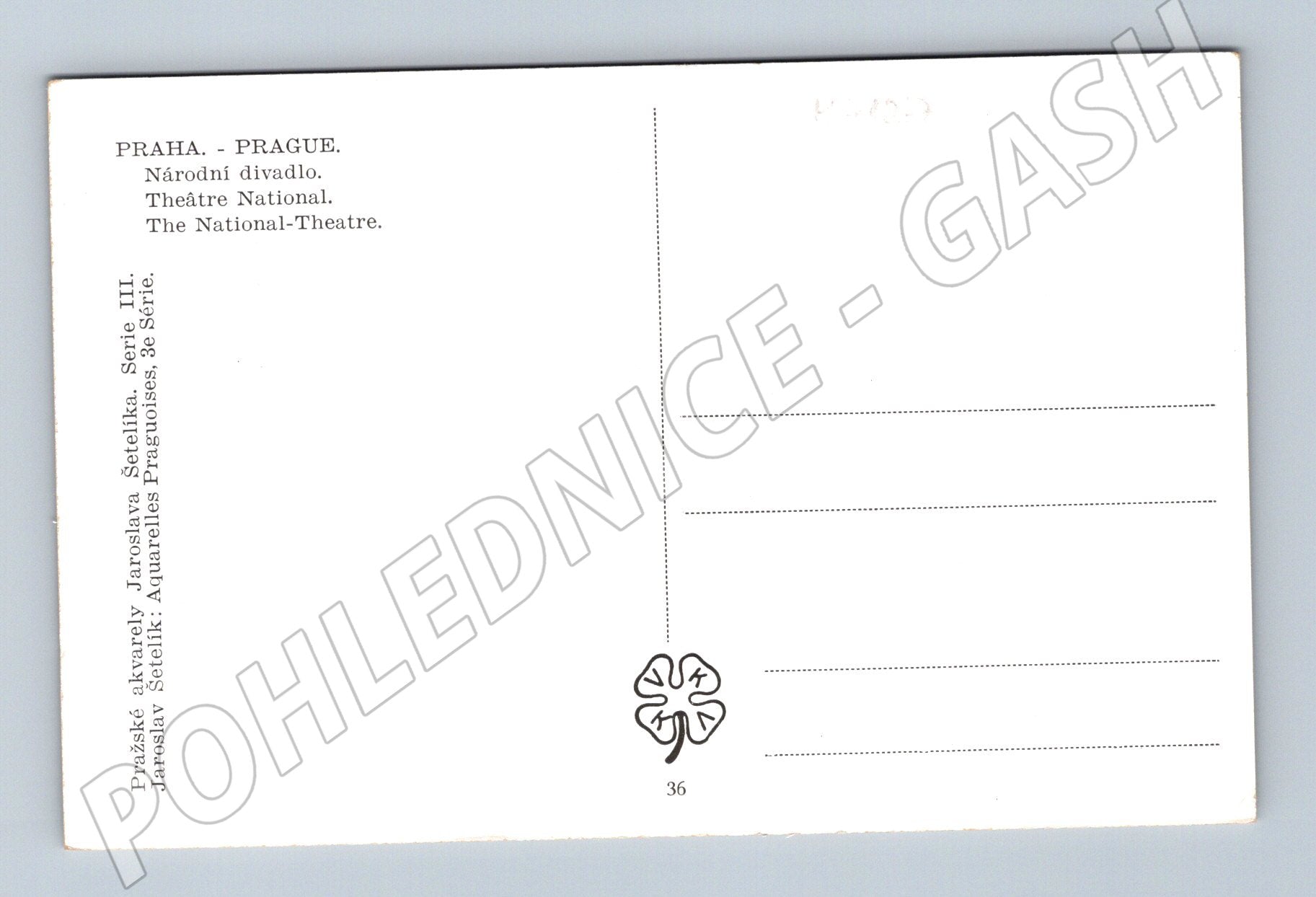Originální historická pohlednice s akvarelovým motivem Národního divadla v Praze od Jaroslava Šetelíka. Pohlednice je součástí série Pražské akvarely , série III, číslo 36. Na zadní straně ve více jazycích (česky, francouzsky, anglicky) uvedeno: Národní divadlo (Théâtre National, The National-Theatre). Velmi pěkný sběratelský stav, neprošlé poštou, čistá zadní strana. Rozměr pohlednice odpovídá tradičnímu malému formátu, vhodné pro milovníky pražské architektury a historických pohlednic.