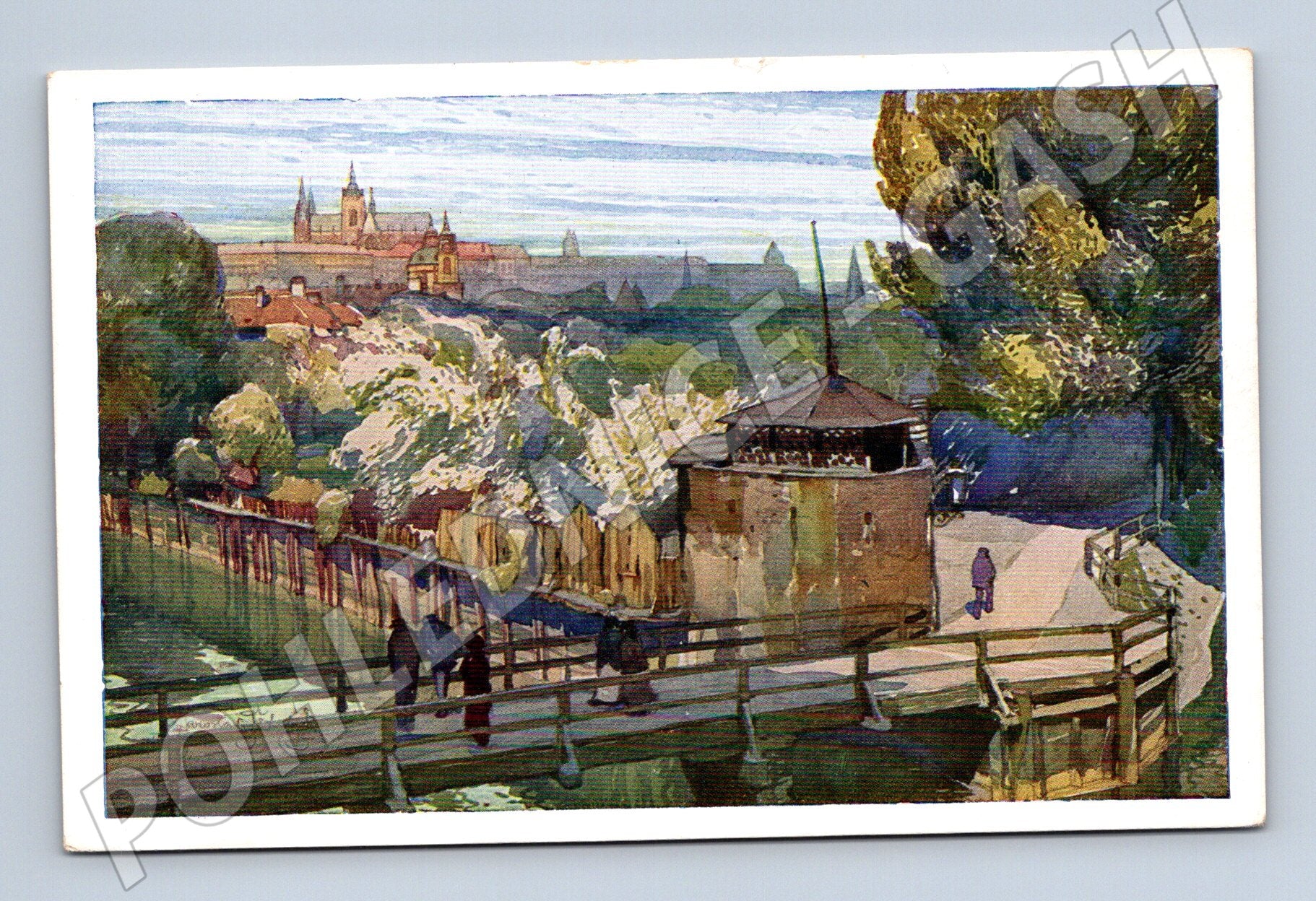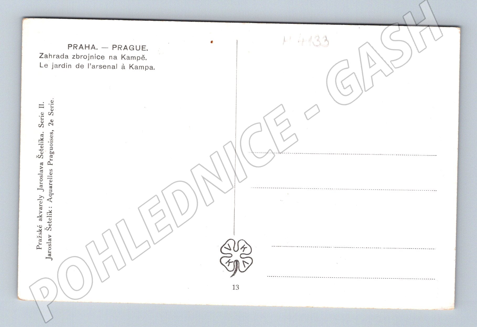 Praha - Zahrada zbrojnice na Kampě, akvarel Jaroslav Šetelík, stará pohlednice