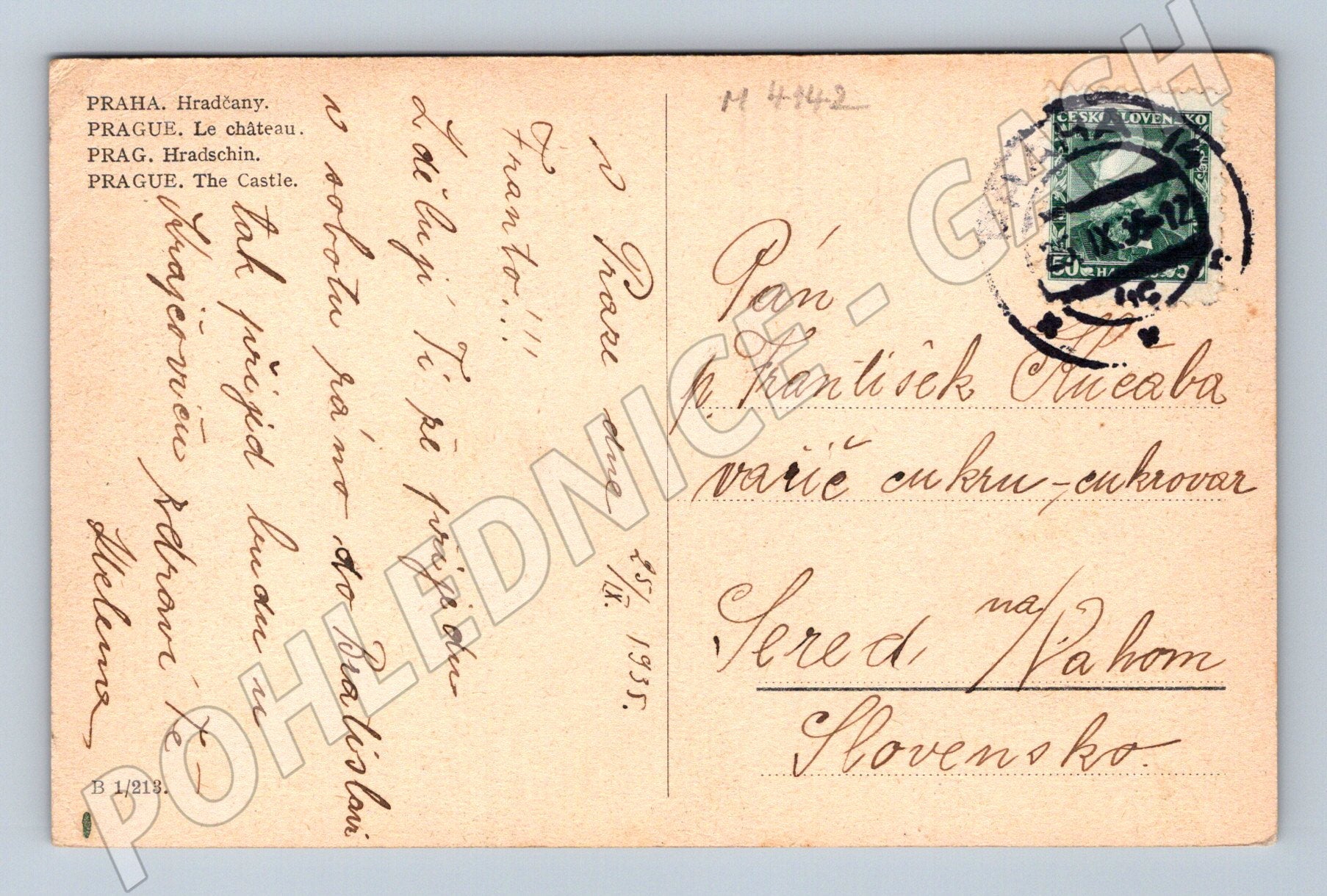 Originální stará pohlednice s pohledem na Pražský hrad a Hradčany v Praze. Černobílá fotografie zachycuje dominantu města s katedrálou sv. Víta a okolní zástavbou. Pohlednice byla odeslána ve 30. letech 20. století a nese známku a čitelné razítko. Na zadní straně je ručně psaný text v češtině adresovaný na Slovensko. Pohlednice je vhodná pro sběratele starých pohlednic z období první republiky či zájemce o pražské historické památky. Stav viz foto, drobné opotřebení odpovídající stáří. Velmi pěkný sběratelský kus z období do roku 1950.