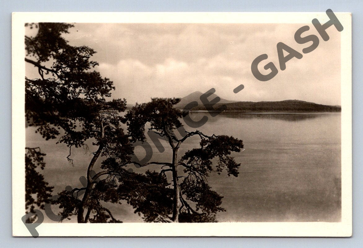 Starší pohlednice zachycující Letovisko Doksy - Stará Splavy u Máchova jezera. Černobílý snímek ukazuje klidnou hladinu jezera Máchovo, obklopenou borovicemi v popředí a vrcholky kopců v pozadí. Pohlednice je v dobrém stavu, na zadní straně je razítko s nápisem Máchovo jezero Doksy a natištěný popis místa. Ideální sběratelský kousek pro milovníky českých přírodních lokalit a historických pohlednic.