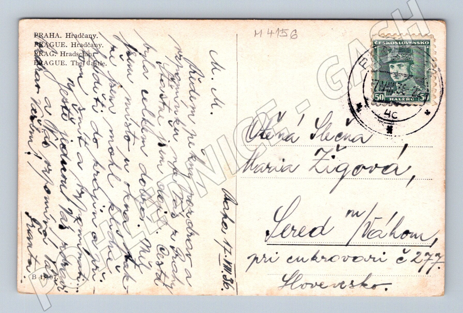 Originální historická pohlednice s motivem Hradčan v Praze, zachycující slavný Pražský hrad a Karlův most. Pohlednice je v klasickém malém formátu a podle použité známky a razítka pochází z období první poloviny 20. století. Pohlednice je použita, zadní strana obsahuje ručně psaný vzkaz, známku ČSR a poštovní razítko. Výborný sběratelský stav, stopy stáří a poštovní přepravy. Ideální pro sběratele starých pohlednic Prahy či československé poštovní historie.