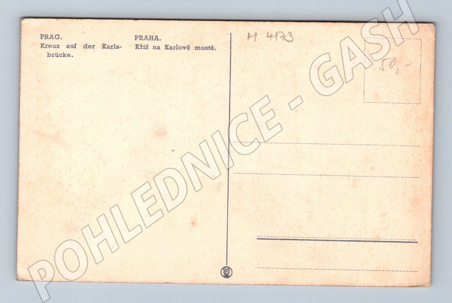 Originální stará pohlednice zobrazující slavný motiv Kříže na Karlově mostě v Praze. Na pohlednici je krásný výhled na Pražský hrad a část Malé Strany. Fotografováno v dobovém stylu, pravděpodobně před rokem 1950. Zadní strana pohlednice je rozdělena pro adresu a text, nahoře je nápis v češtině i němčině (PRAG. Kreuz auf der Karlsbrücke / PRAHA. Kříž na Karlově mostě). Pohlednice má lehké známky stáří dle fotografie, doporučuji pro sběratele historických pohlednic z Prahy nebo zájemce o starou architekturu a památky.