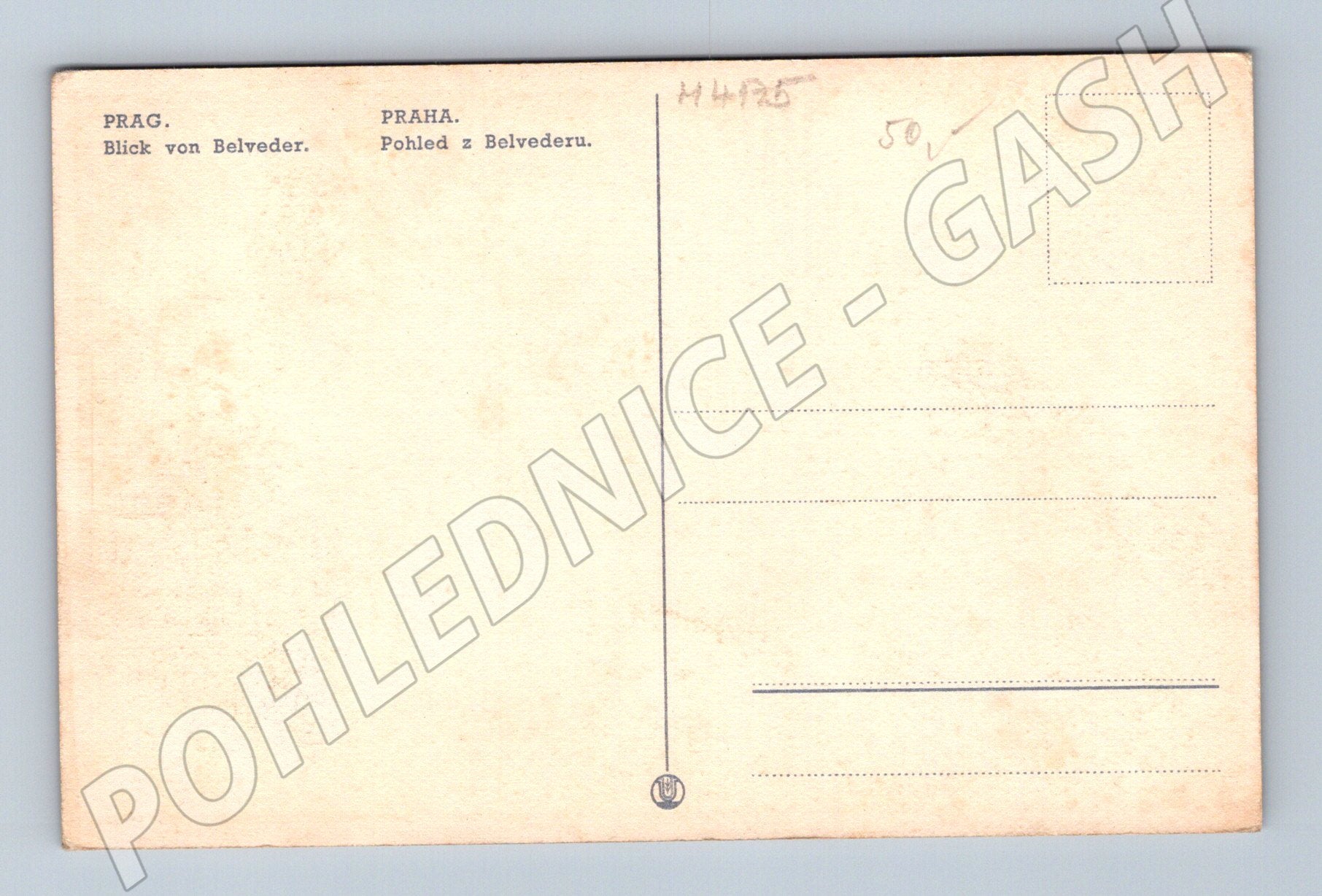 Originální historická pohlednice s pohledem na Pražský hrad a katedrálu sv. Víta, pořízená z Belvederu (královské letohrádku) v Praze. Pohlednice je vytištěna v hnědém tónování a zachycuje jeden z nejikoničtějších výhledů na pražskou dominantu. Na zadní straně najdete nápisy v češtině i němčině – „PRAG. Blick von Belveder. PRAHA. Pohled z Belvederu.“ Stav odpovídá stáří, pohlednice je nepopsaná a neprošlá poštou. Vhodná pro sběratele historických pohlednic a milovníky Prahy.