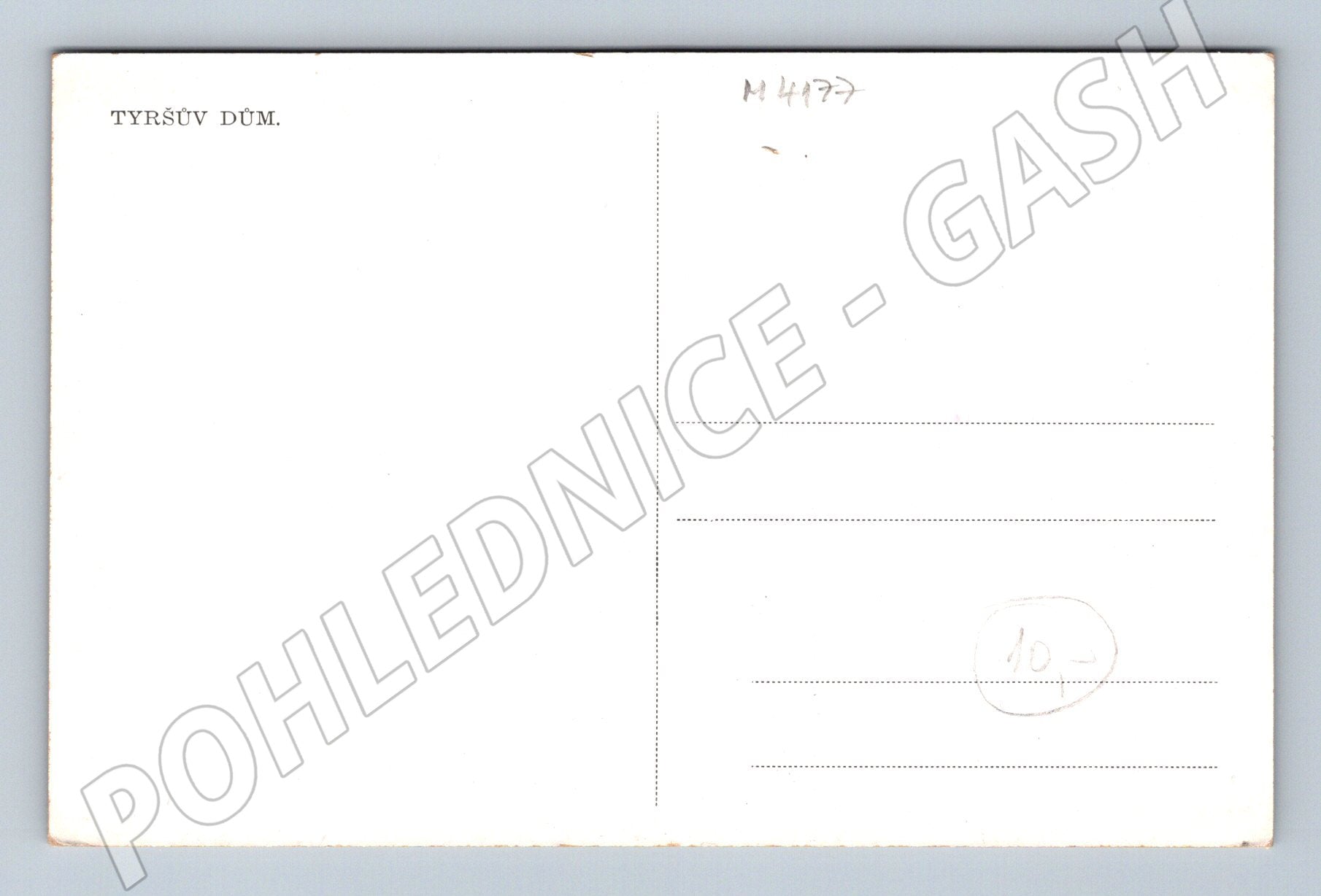 Originální stará pohlednice s motivem Tyršova domu v Praze. Na přední straně se nachází malebná kresba, která zachycuje Tyršův dům obklopený rozkvetlými stromy, v pozadí lze vidět část panoramatu Prahy. Pohlednice není prošlá poštou, zadní strana je nepopsaná, pouze s nápisem Tyršův dům . Tato pohlednice je krásným příkladem české pohlednicové tvorby do roku 1950, vhodná pro sběratele a milovníky historických památek Prahy. Zachovalý stav, viz foto.