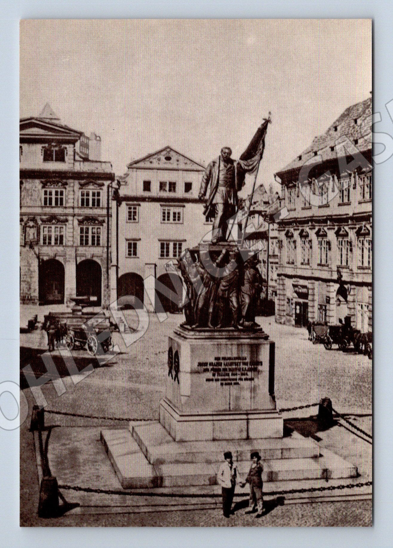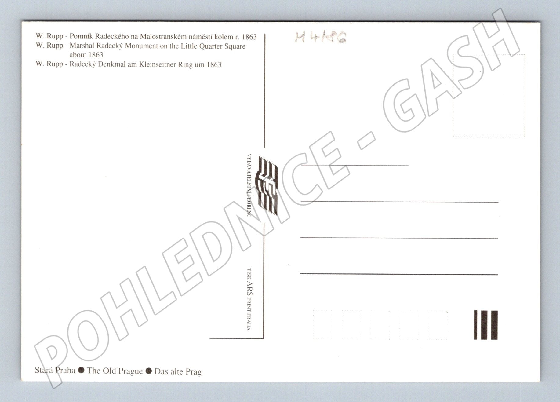 Nabízím historickou pohlednici se zobrazením pomníku maršála Radeckého na Malostranském náměstí v Praze kolem roku 1863. Na přední straně je detailní dobová fotografie sochy od W. Ruppa, v pozadí jsou viditelné původní budovy Staré Prahy. Na zadní straně pohlednice je trojjazyčný popis (česky, anglicky, německy) a označení vydavatelství Florenc, tisk ARS Praha. Pohlednice nebyla použita (neprošlá poštou), je v pěkném stavu, vhodná do sbírky starých pohlednic a milovníkům pražské historie.
