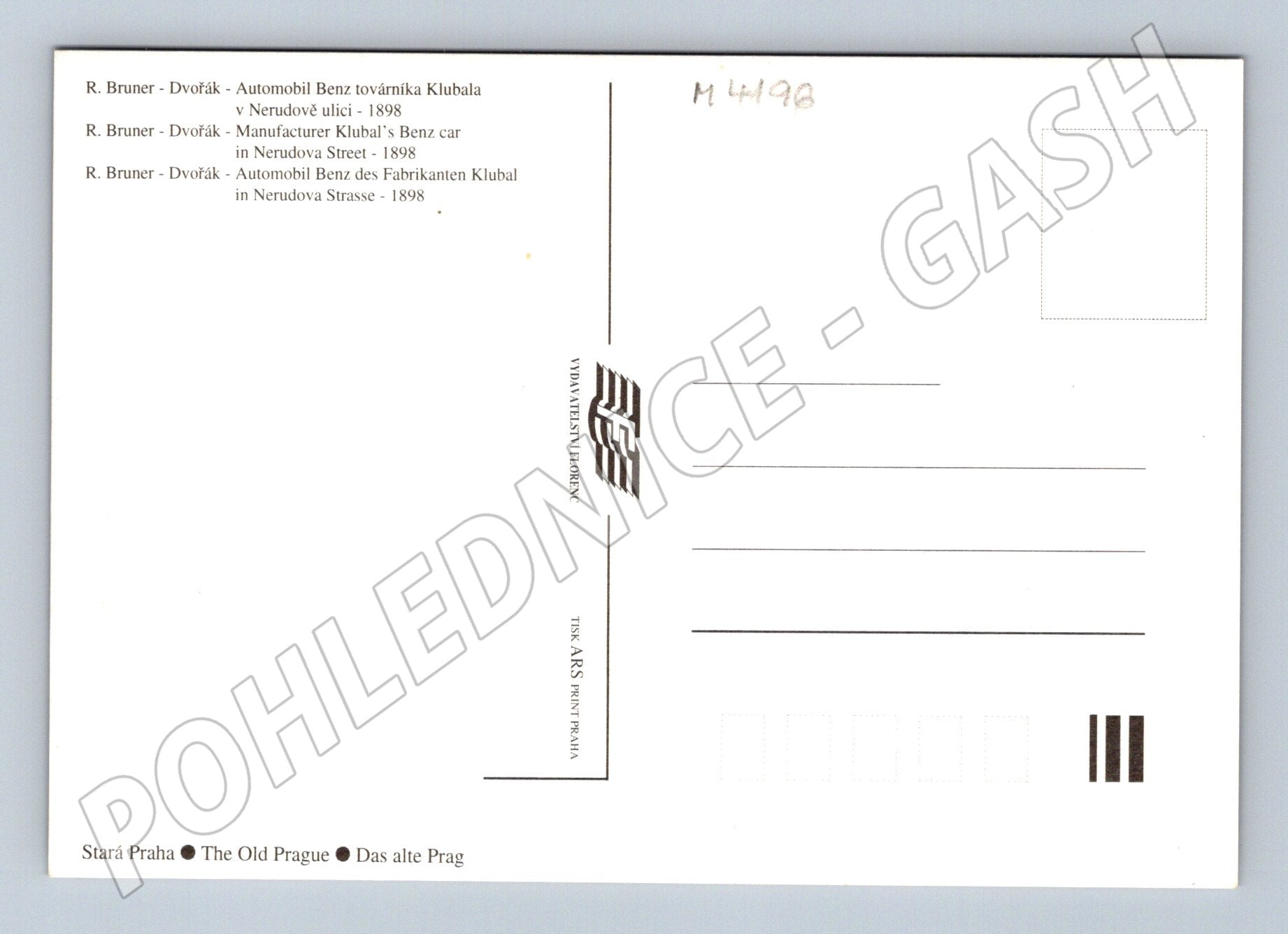 Historická pohlednice zachycující automobil Benz továrníka Klubala v Nerudově ulici v Praze z roku 1898. Autorem fotografie je R. Bruner – Dvořák. Na pohlednici je detailně zobrazen starý automobil Benz obklopený skupinou lidí a dětí na ulici ve Staré Praze, což skvěle dokresluje atmosféru přelomu 19. a 20. století. Zadní strana pohlednice obsahuje popis v několika jazycích. Perfektní sběratelský kousek pro milovníky historie dopravy, Prahy a starých automobilů.