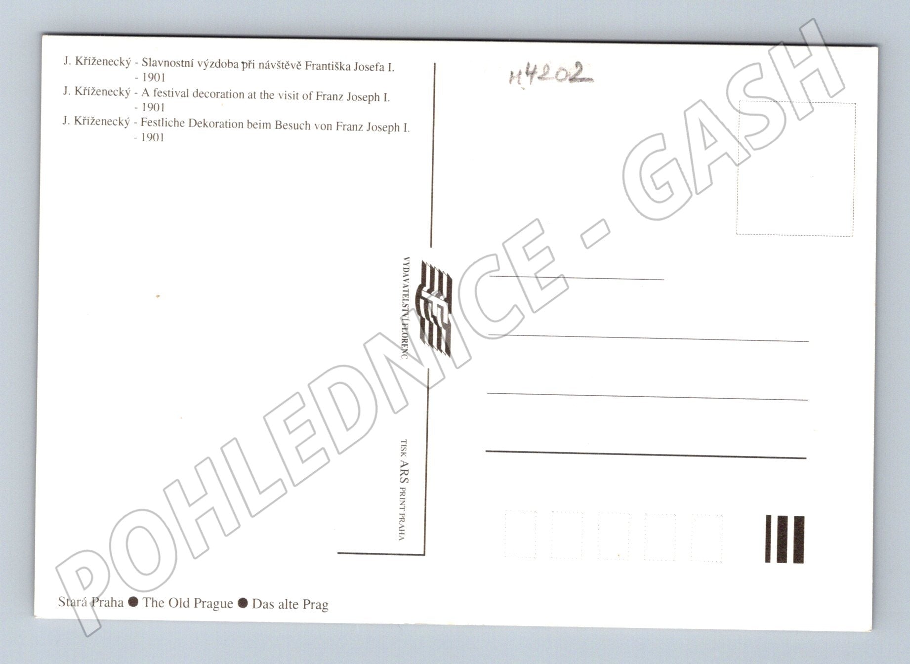 Pohlednice z edice Stará Praha / The Old Prague / Das alte Prag zachycuje slavnostní výzdobu při návštěvě Františka Josefa I. v roce 1901 podle návrhu J. Kříženeckého. Na přední straně je historický pohled na krásně vyzdobené průčelí s alegorickými sochami a slavnostní bránou, včetně osob v dobovém oděvu. Zadní strana nabízí popis v češtině, angličtině a němčině. Vydavatelství Florenc, tisk ARS. Skvělý sběratelský kousek s hodnotnou historickou tématikou staré Prahy. Neprošlá poštou, výborný stav.